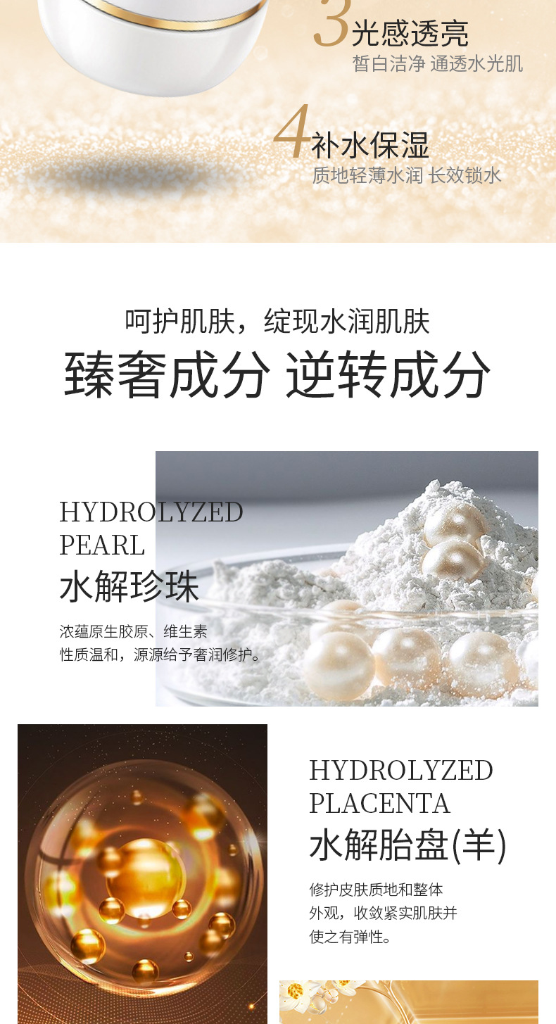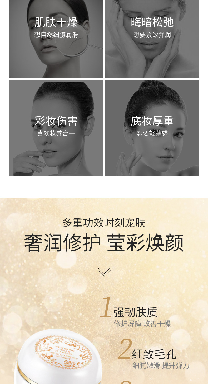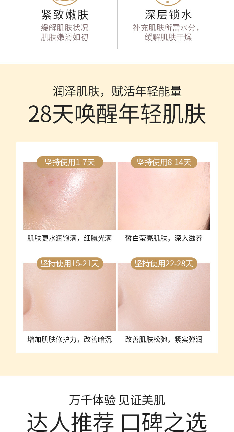 改善肌肤暗沉泛黄提高肌肤光泽度、修复干燥粗造肌肤、滋润美白、柔软肌肤、持久保湿、能延缓肌肤衰老、缩小毛孔、紧致肌肤、增强皮肤弹性。对天生黑黄肌肤、瑕疵、粗黑肌肤、暗哑无光、不均匀肌肤特有效果。