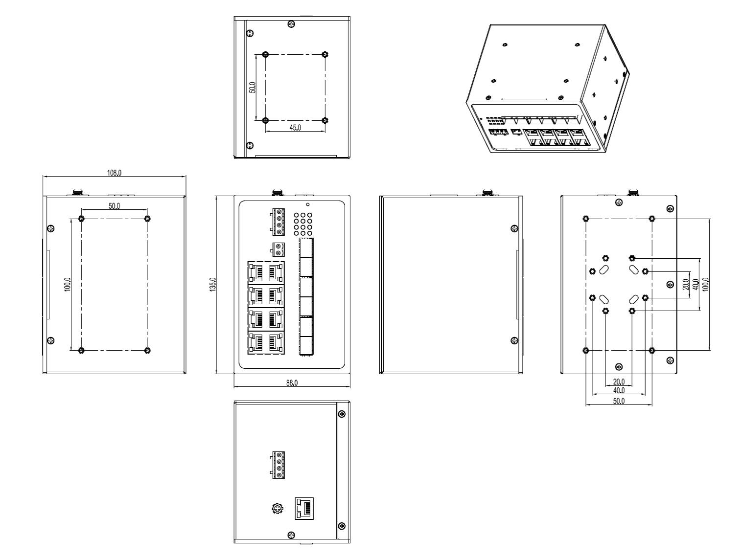 10/100/1000Base-T(X), RJ45接口 长距离端口 RJ45接口,达到300米100Mbit/s,900米10Mbit/s Console口 RS232,RJ45接口 RS485 1路RS485串行总线,2000V隔离防护,2芯5.08mm间距插入式端子 RS232 1路RS232, RX/TX/GND/3.3V, 160mA,4芯5.08mm间距插入式端子