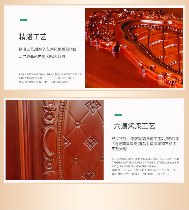 4.如果雕花门上积聚的灰尘要及时清理,可以使用吸尘器。定制室内烤漆门 别墅用卧室平开门 加厚实木复合雕花门,另外,应定期使用家具保养液和保养蜡对实木复合门进行保养