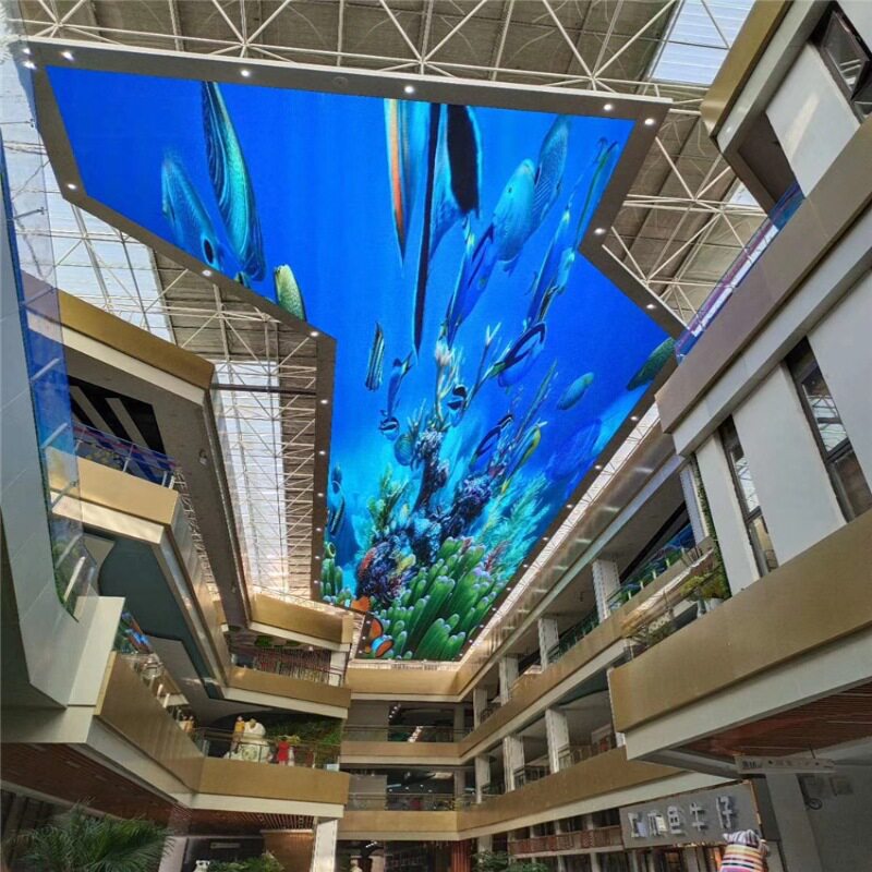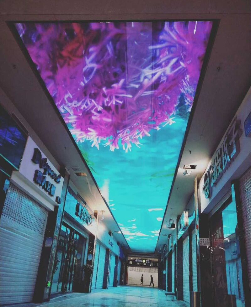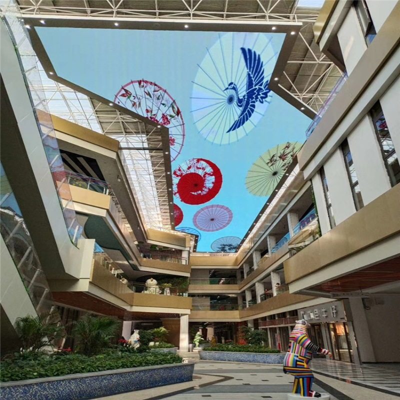 LED天幕通常适用于大型建筑的天花板,例如星级酒店大堂,购物中心中庭、车站、机场、科技馆等地。