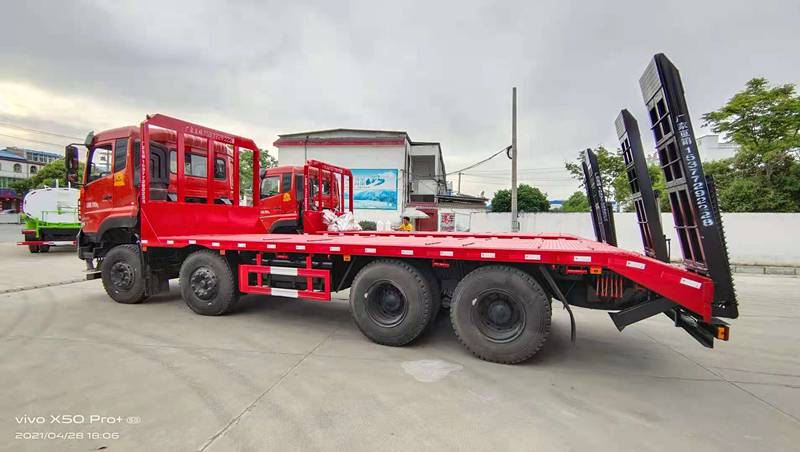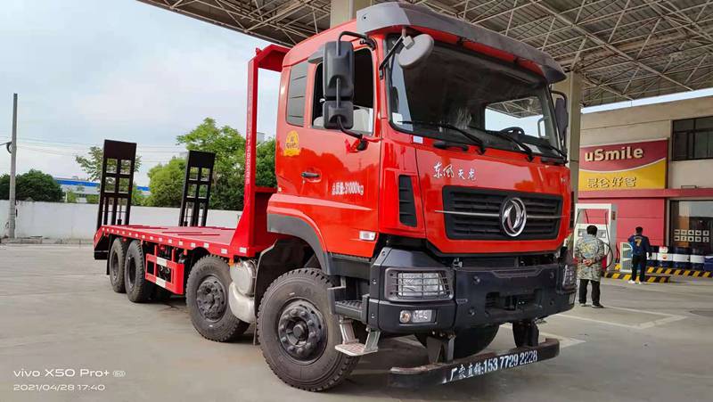 东风天龙前四后八国六平板运输车 主要配置:雷诺430马力,东风龙擎14档变速箱带高低档,东风天龙新款KC驾驶室,16吨后桥,1100R20钢丝胎,轴距:2050+3200+1350,气囊座椅,中控锁,电动门窗,钥匙,原厂空调,尺寸:10250/11250 *2550*3350。总质量31吨,额定15.39/16.795吨,整备14.075/15.48吨;