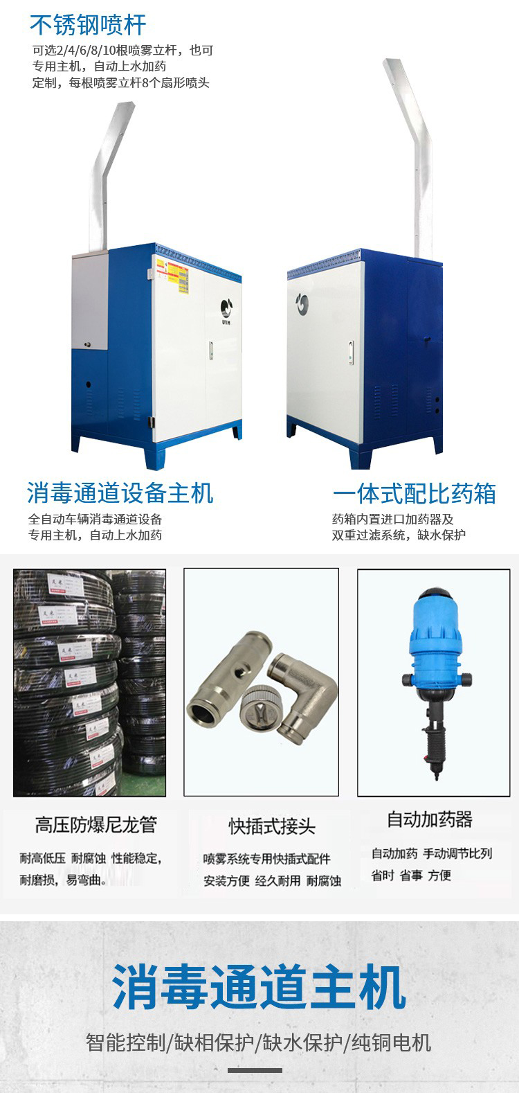 3、自动化程度高:无需专人值守,车辆经过消毒系统,设备自动启动工作,消毒完成后设备自动停止工作,省时省力可很大限度上节省人力资源成本。