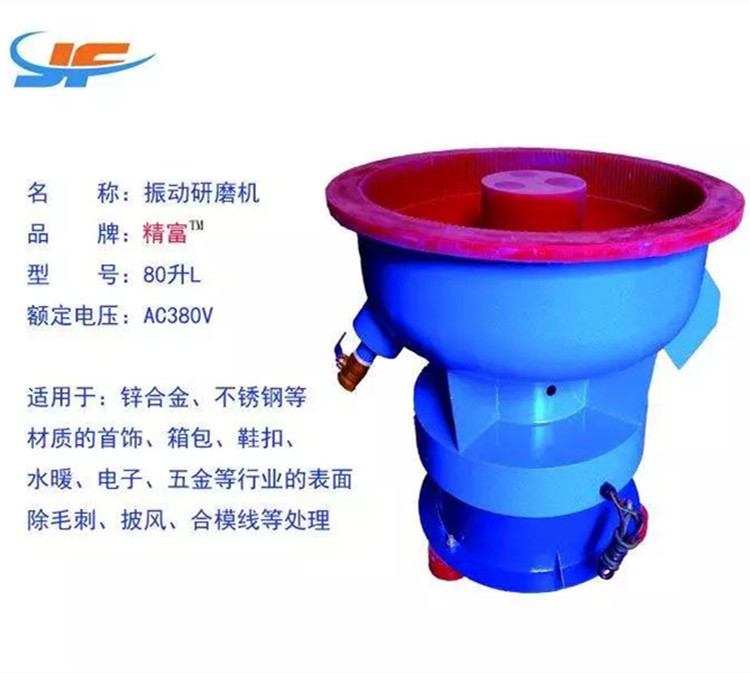 通过振动电机高速旋转所产生的激振力由弹簧的作用,使研磨槽内的研磨石、水和研磨液同被加工的零件产生规律性的相对运动。然后得到互相挤压,把凸出于零件表面的毛刺或氧化层磨掉,亦可将锐角倒圆和光亮抛光等。