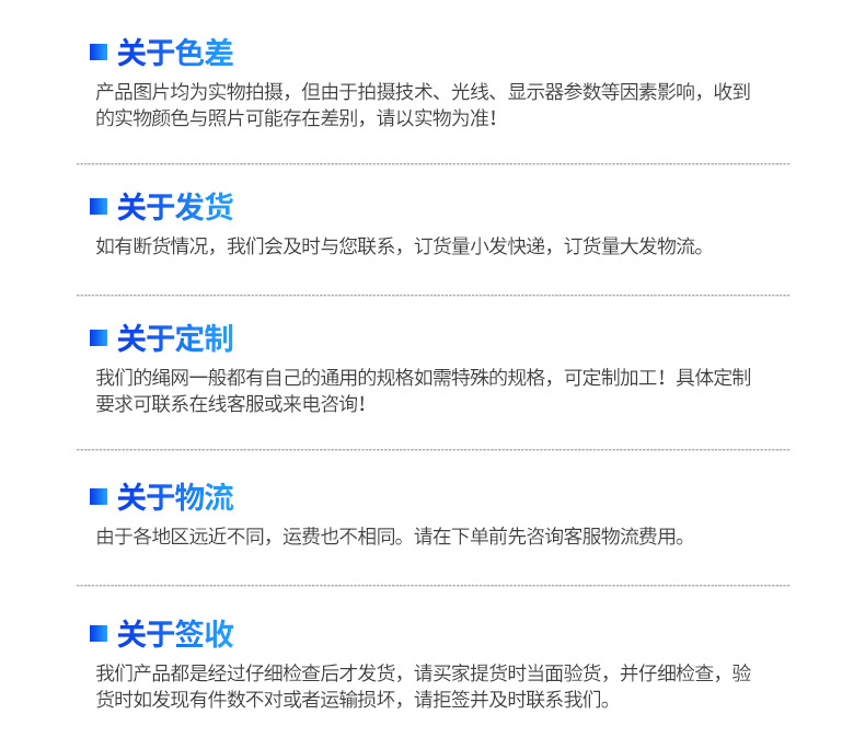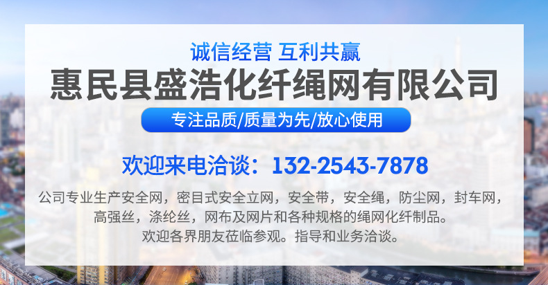 山东惠民盛浩化纤绳网有限公司始建于1998年,坐落于物华天宝,人杰地灵的鲁北平原、孙子故里。位于济南至滨州220国道中段姜楼镇驻地。姜楼镇生产绳网已有300多年的历史,被益为绳网之乡,其交通便利,经济发展迅速,安全网,密目网,安全带,安全绳及各种化纤制品规格齐全,2009年被定为国家劳动部定点生产企业。公司占地面积8000平方米,现有职工300人,技术人员178人,现有国内先进丙纶高强丝流水线设备两套,捻线机10台,合绳机8台,先进大眼织网机,小眼织网机各一套。拉丝机7台,整经机7台,大型织网机20台,织带机3台。主要生产安全网,密目式安全立网,安全带,安全绳,防尘网,封车网,高强丝,涤纶丝,网布及网片和各种规格的绳网化纤制品。公司通过了ISO9001:2000国际质量管理体系认证,拥有进出口经营权证,产品由中国人民财产公司承担产品质量。连年被评为市级“重合同.守信誉”企业,消费者满意单位。公司产品在北京,上海,天津,重庆,成都,长沙,武汉昆明等全国各大中城市销售,并远销港澳,新加坡,中东,欧美等国家和地区。公司在全国设有办事机构多处,质量信誉反馈及时,市场需求信息准确。山东盛浩化纤绳网有限公司全体员工热诚欢迎国内外新老客户来公司光临指导,共谋发展,迈向未来。
