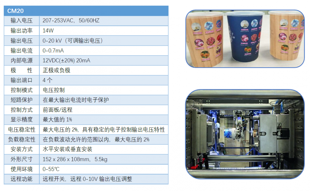CM-20-N/P静电产生器,SIMCO-ION(美国)制造,具有远程开关接口,可匹配PLC进行自动化开/关,面板电压上下调节键,数字显示,CE电气安全认证,安全耐用,是目前在IML模内贴标所应用最多静电产生器之一。