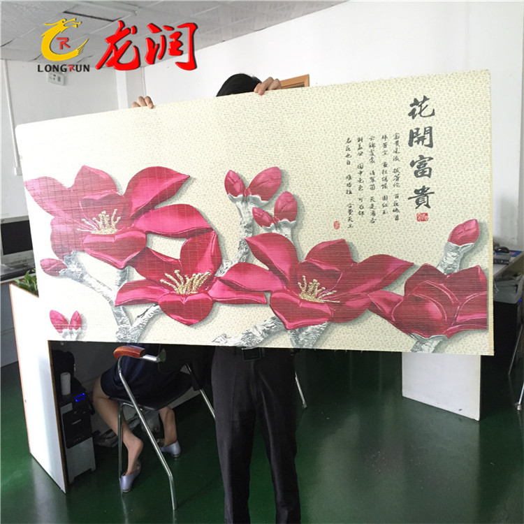 2、雕刻机+喷砂机+UV平板打印机制作瓷砖背景墙或者是喷涂层+烘干箱+瓷砖背景墙彩印机+光油结晶。3D彩雕背景墙彩印机在瓷砖表面上直接喷墨印刷的机器,UV智能打印机直接喷印彩色图案,可以制作浮雕效果,特制的墨水使打印色彩鲜艳,防晒防水,而且不限材质打印;3D浮雕平板印刷机可以在任何材料上作高精度的直印彩绘喷画印刷,改变了传统印刷设备的技术原3D彩雕背景墙彩印机不用雕刻,不用丝印,不用转印,不用胶印,不用移印等传统印刷工艺,一台机器即可完成所有材质的全彩图案印制,工艺简单、效果精美、成本低廉。