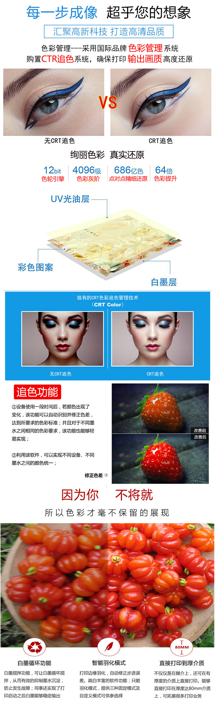 3、3D彩雕UV平板打印机就是直接用UV平板打印机打印哪些地方需要浮雕起来的,用白色墨加黑色墨打印一遍出浮雕效果,再上彩色,图案需要4D效果矢量图。色彩鲜艳,效果逼真十足,效果栩栩如生、绚丽多彩、防水,防晒防耐磨、图案呼之欲出。