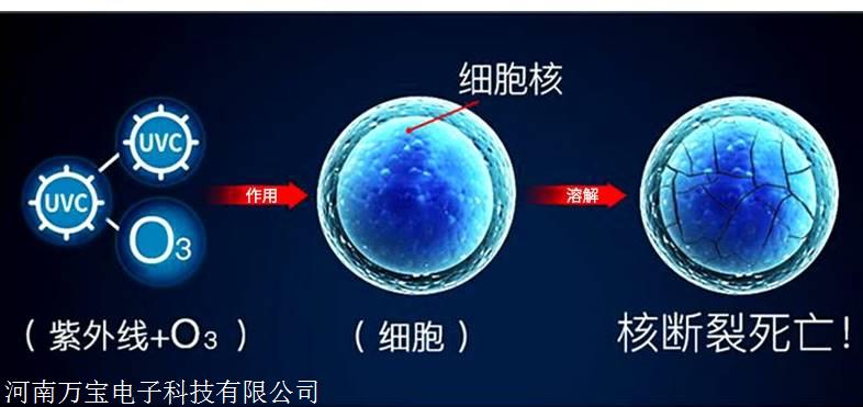 通过紫外线的照射加臭氧的循环,穿透微生物的细胞,破坏各种病菌,细菌,寄生虫以及其他致病体的DNA结构,毁坏其核酸分子键,使细菌当即死亡或不能繁殖后代,从而达到消毒灭菌的作用。破坏及改变微生物的DNA(脱氧核糖核酸)结构,达到杀菌的目的。