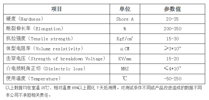 4.固化后的硅橡胶具有良好的电气绝缘性能、耐高低温、防水防潮、耐老化、长期保持橡胶弹性。