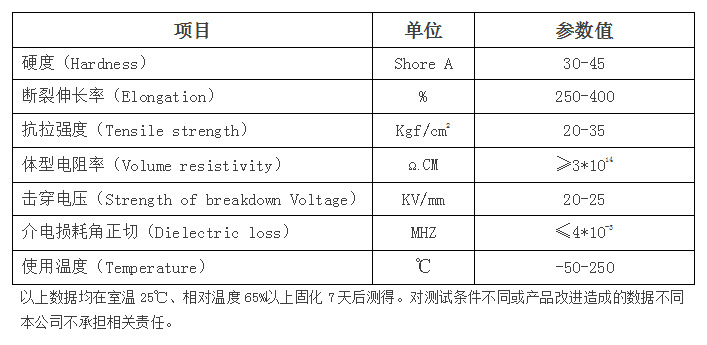 4.固化后的硅橡胶具有良好的电气绝缘性能、耐高低温、防水防潮、耐老化、长期保持橡胶弹性。