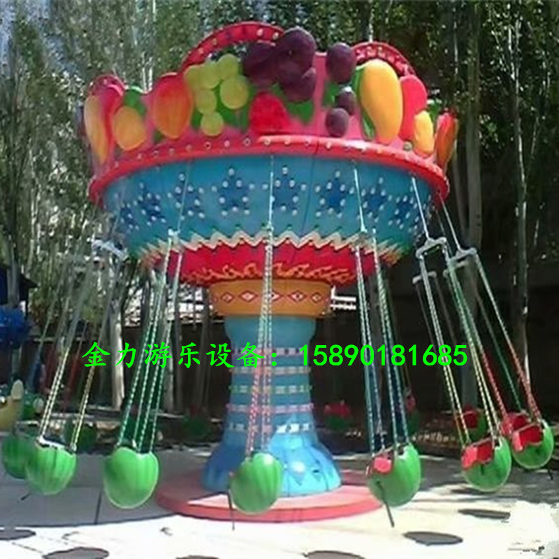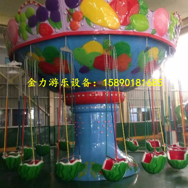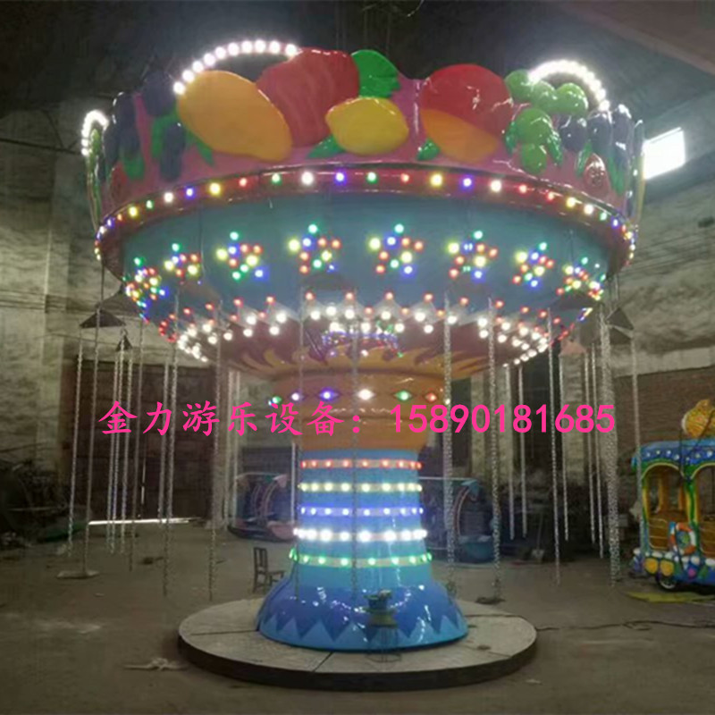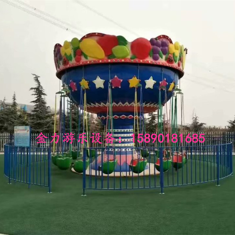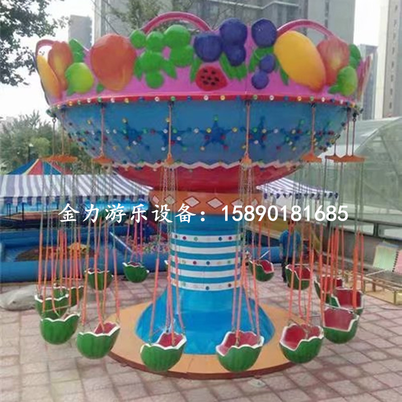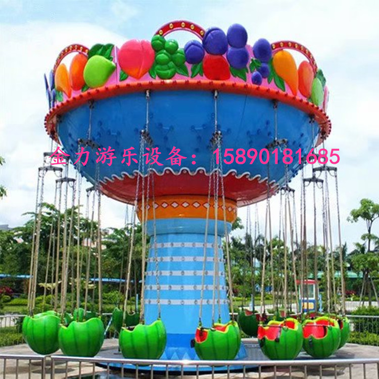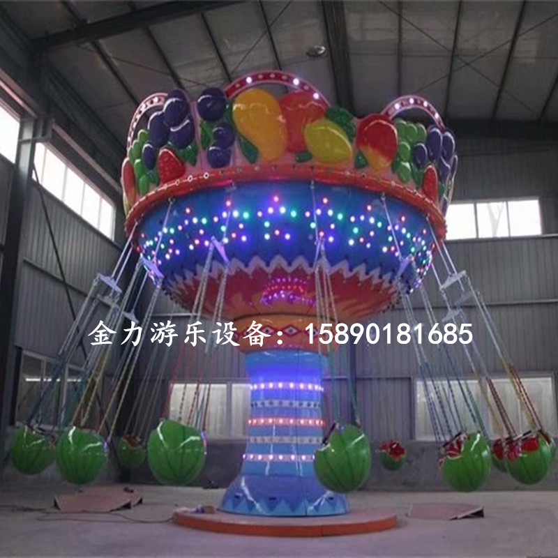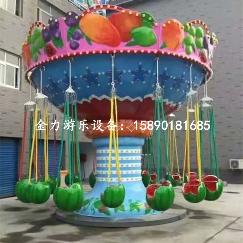水果飞椅,也称水果旋风,是一款经典的游乐设备。其靓丽的外表和充满刺激性的游戏形式很受大家的欢迎。外在的水果造型色彩鲜艳,栩栩如生更是让人驻足。设备顶部飞檐和中心柱玻璃钢均配有彩灯,在夜幕下更是美轮美奂。乘客乘坐在吊椅上能体验到飞翔的感觉,收获无比的快乐!
