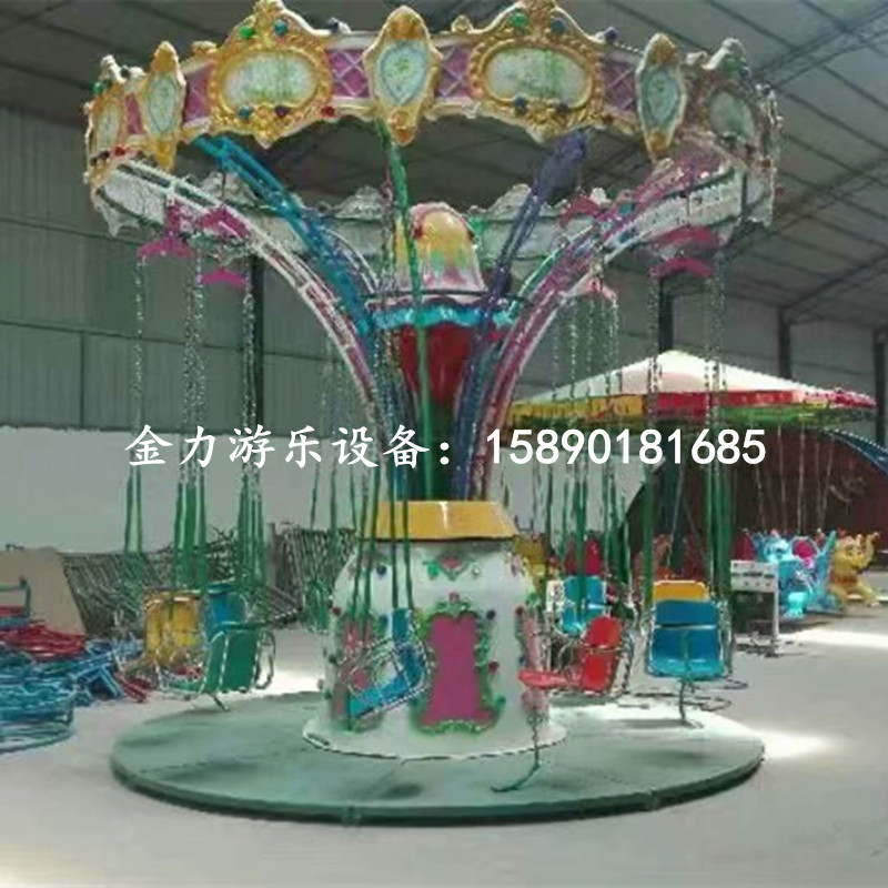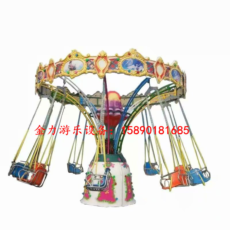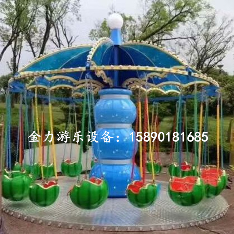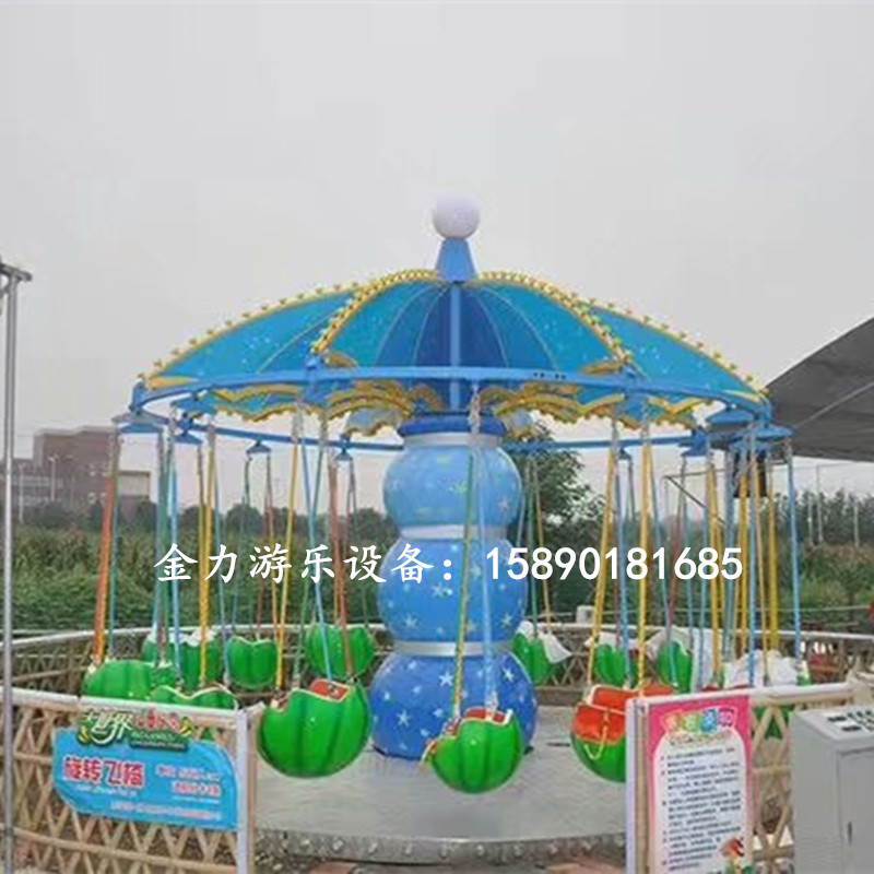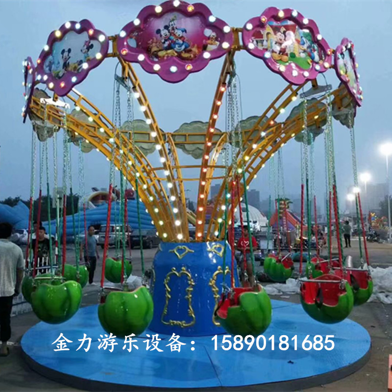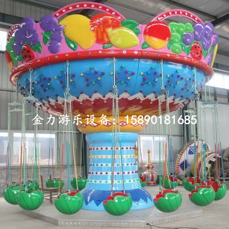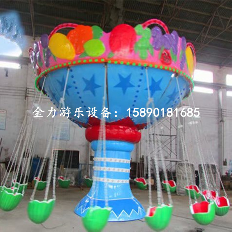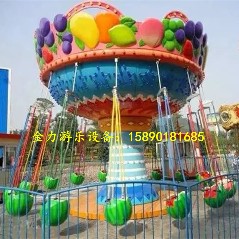 水果飞椅,也称水果旋风,是一款经典的游乐设备。其靓丽的外表和充满刺激性的游戏形式很受大家的欢迎。外在的水果造型色彩鲜艳,栩栩如生更是让人驻足。设备顶部飞檐和中心柱玻璃钢均配有彩灯,在夜幕下更是美轮美奂。乘客乘坐在吊椅上能体验到飞翔的感觉,收获无比的快乐!