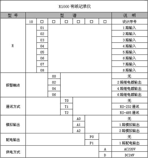 例:RX1002F-T1-A0-P0-A 表示:2路F0值输入,RS-232通讯,220V供电。