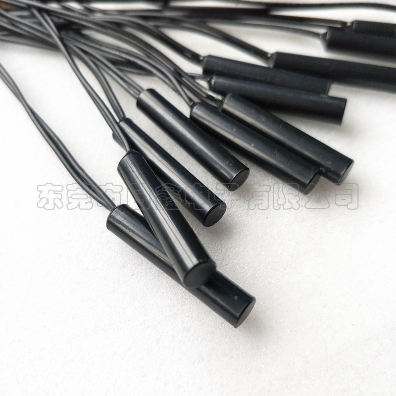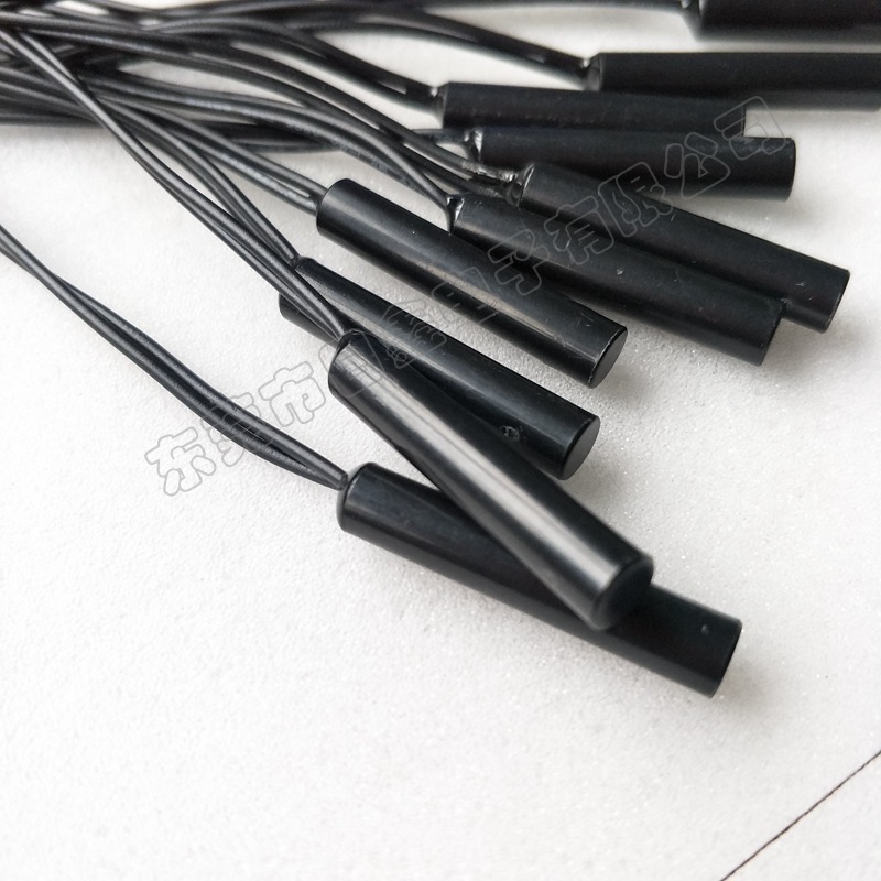 嵌入式干簧管/磁簧开关也称舌簧管或塑封干簧管,是一种磁敏的特殊开关,全系列采用ABS环保塑料包裹。它通常有两个软磁性材料做成的、无磁时断开的金属簧片触点,有的还有第三个作为常闭触点的簧片。这些簧片触点被封在充有惰性气体(如氮、氦等)或真空的玻璃管里,玻璃管内平行封装的簧片端部重叠,并留有一定间隙或相互接触以构成开关的常开或常闭触点。