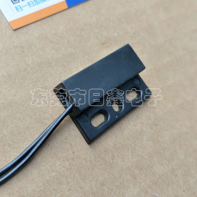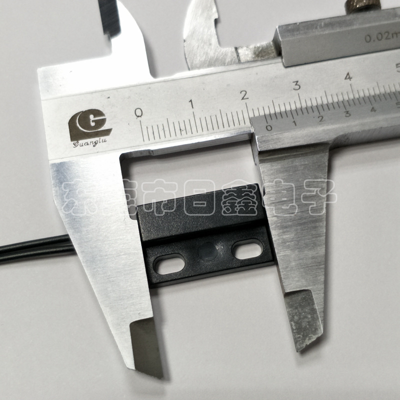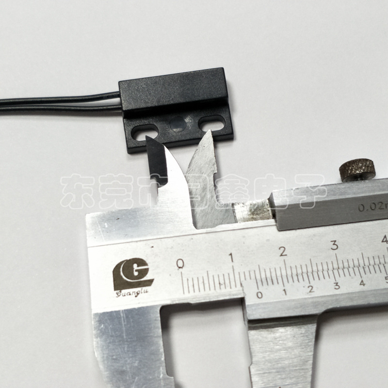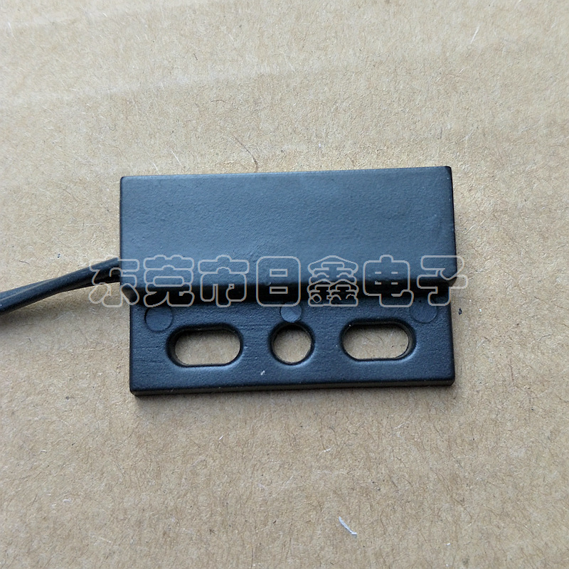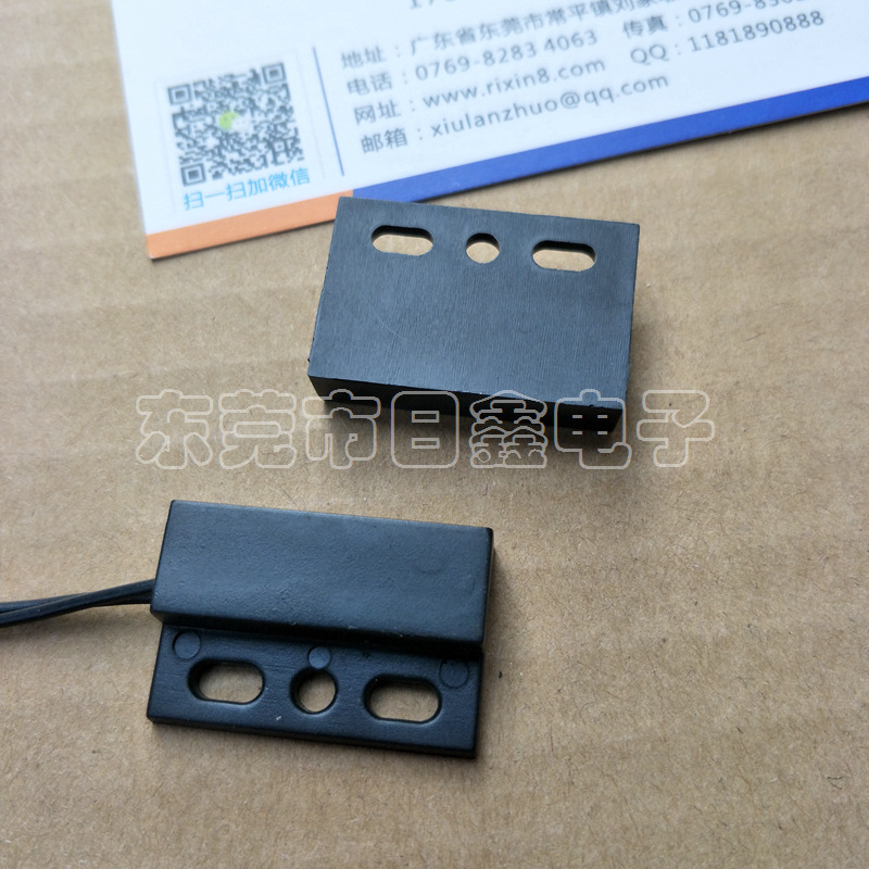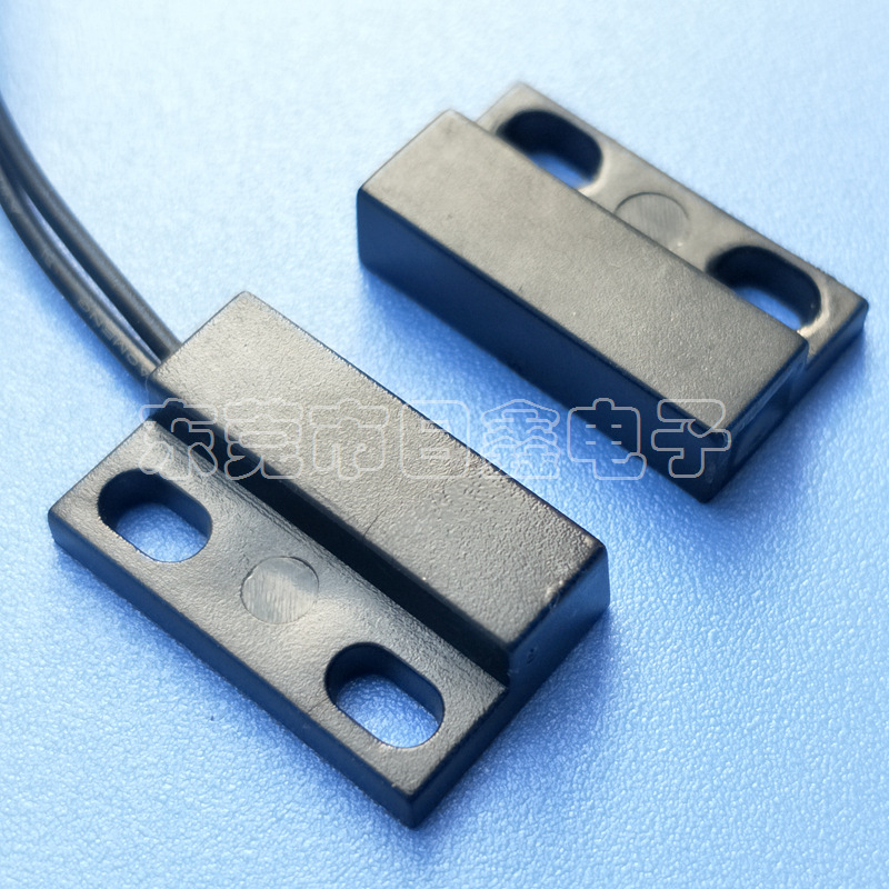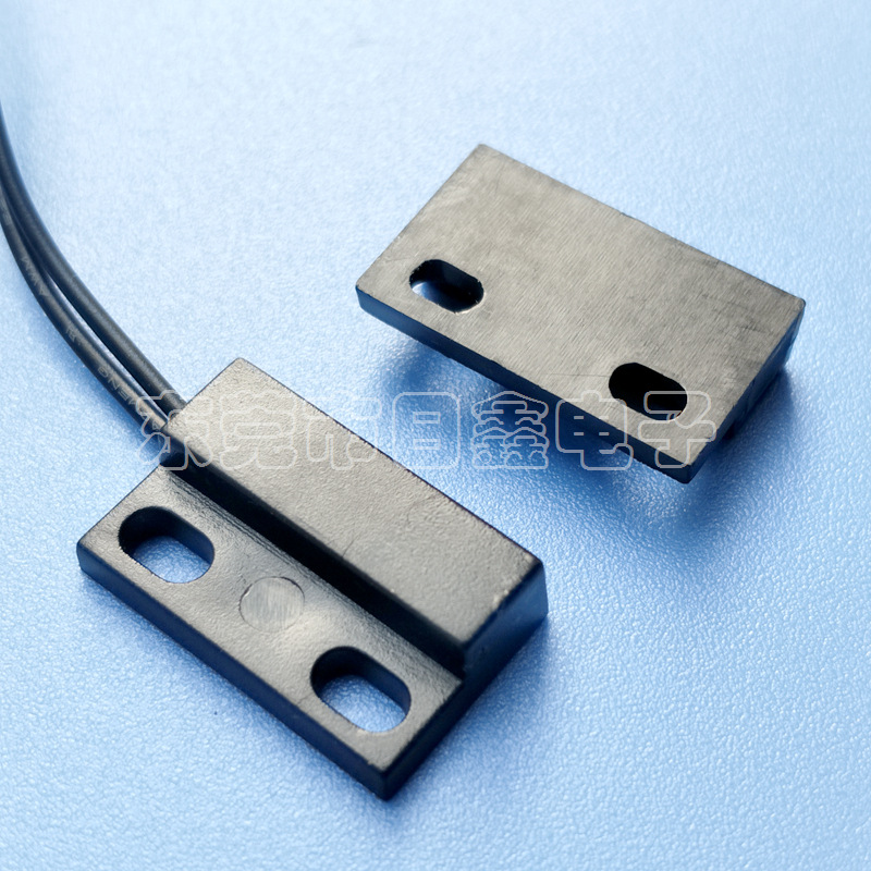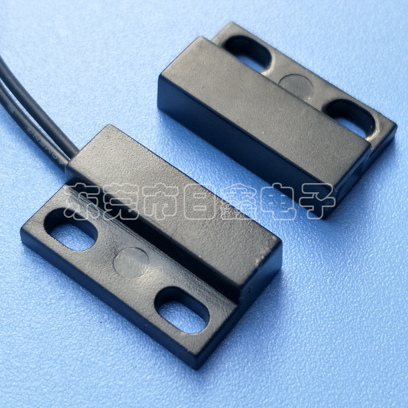 门磁接近开关主要由开关和磁铁两部分组成,开关部分由磁簧开关经引线连接,定型封装而成,磁铁部分由对应的磁场强度的磁铁封装于塑胶壳体内,当两者分开或接近至一定距离后,引起开关的开断从而感应物体位置的变化。