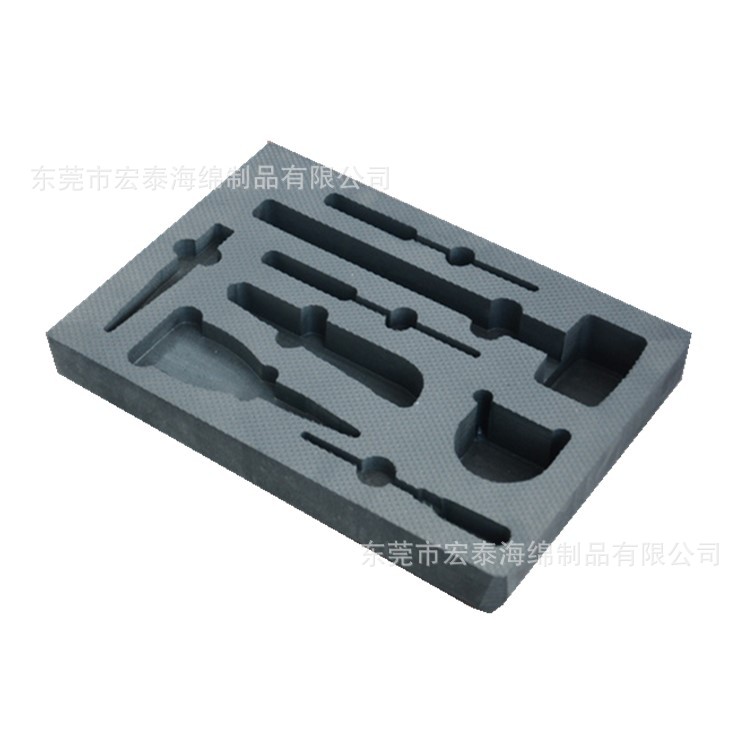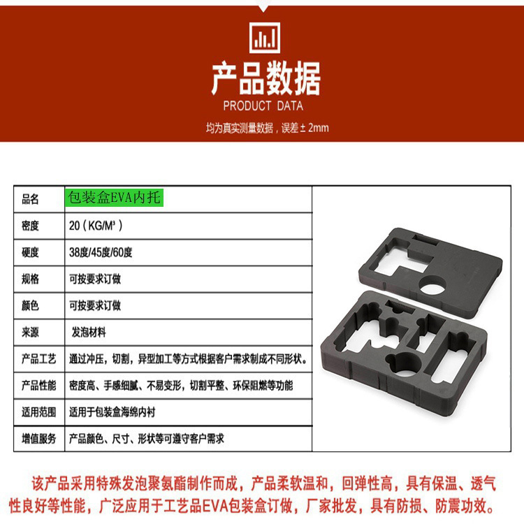 | EVA内衬的特点 防震性:回弹性和抗张力高,韧性强有良好的防震/缓冲性能。 环保性:EVA原料本身为无毒环保材料,可生物降解,是出口产品的不二选择。 耐腐蚀:耐海水、油脂、酸、碱等化学品腐蚀,抗菌、无毒、无味、无污染。 保温性:保温及防寒性能优异,可耐严寒和曝晒。 无异味:EVA是环保无异味材料,适合做各种产品的包装内衬。 EVA内衬的应用 内衬广泛应用于首饰、瓷器、工具箱、电子产品、仪表仪器、礼品盒、玩具、工艺礼品、饰品、化妆品、医药、五金、酒类、家具、灯饰等包装领域,为产品提供防震、防潮、装饰、保护等作用。