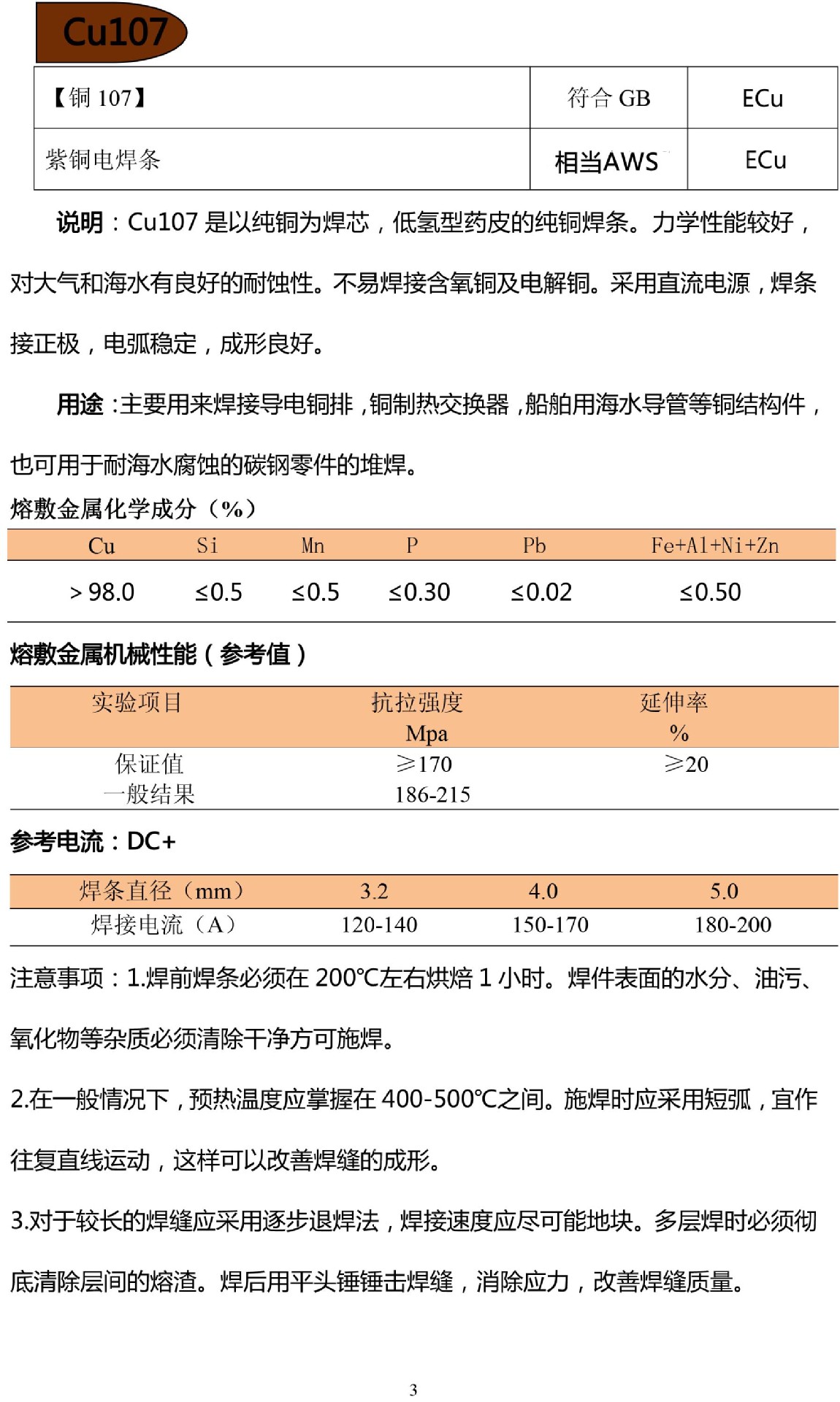 T107为紫铜焊条,对大气和海水有较好的耐蚀性,主要焊接导电铜排,导管等铜结构件。