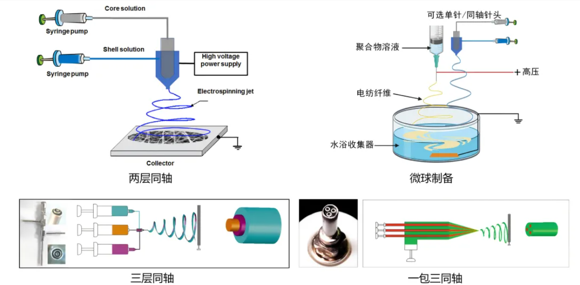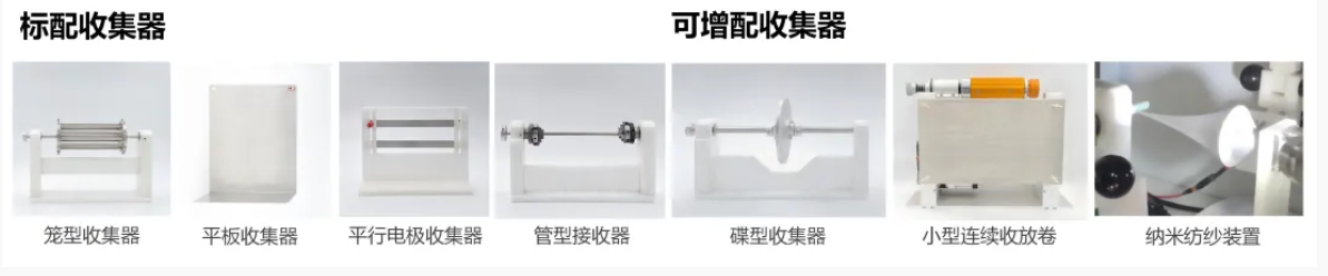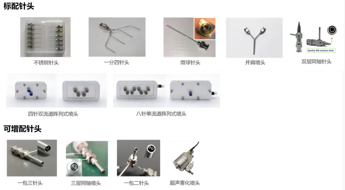 标配双层同轴喷头,可制备中空、同轴、核壳、微球等结构的纳米纤维