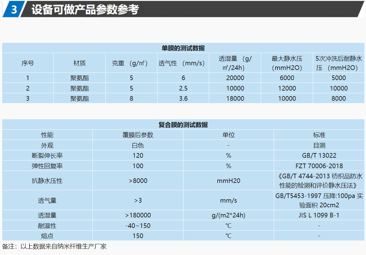 我司利用20多年静电纺丝行业技术储备,研究开发了纳米纤维防水透气膜砖业生产线和工艺技术,生产不含氟的高段多功能纳米纤维膜材料,材料孔径小而均匀、孔隙率高,柔软性好,因其良好的孔径均匀性和高孔隙率,使得膜材料具有较好的防水透气性能,通过对纤维膜的孔结构和表面润湿性进行准确调控可实现其在防水透湿领域的应用。