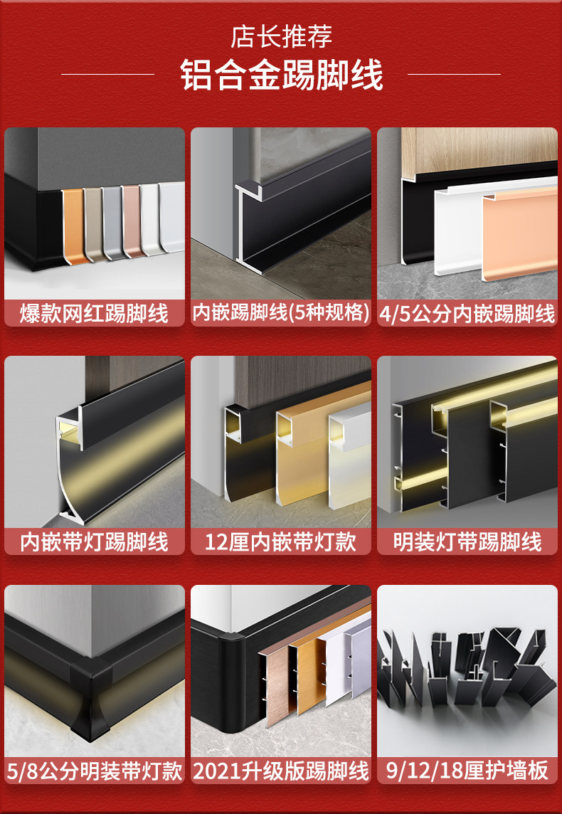 铝合金踢脚线是一种新兴的高档建筑装修材料,这种地脚线是以铝合金型材为原材料,经过严格的技术工艺处理(表面磨砂氧化处理,表面喷涂或表面拉丝氧化处理),特别适合于宾馆,酒店,公共场所及别墅装饰之用。是新一代环保时尚的装饰精品。使装修效果更理想。