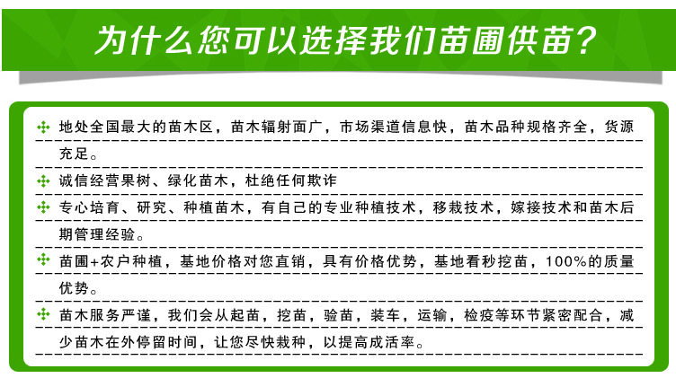 (一)果树苗:[樱桃苗][香椿苗][侧柏苗][香椿苗][海棠苗][梨树苗][花椒苗][山楂苗][柿子苗][桃树苗][梨树苗][苹果苗][板栗苗][杏树苗]等;