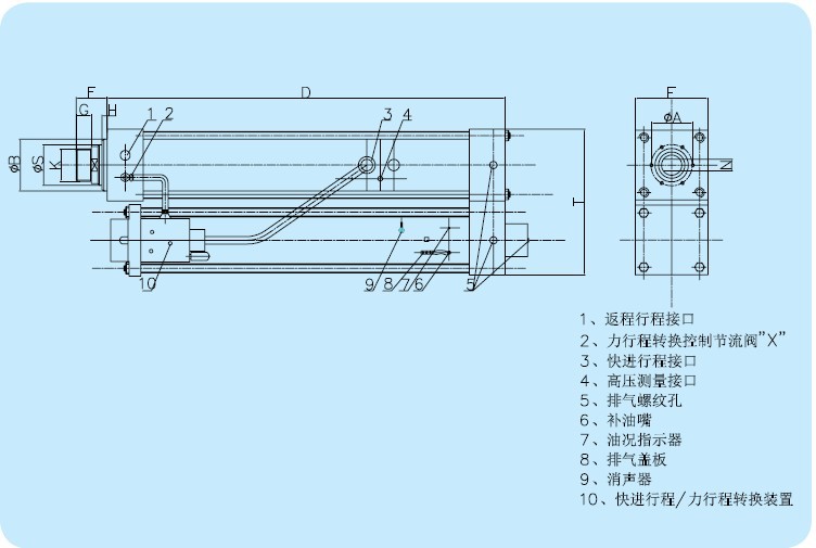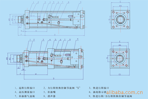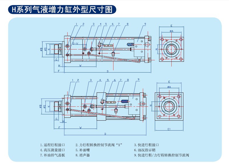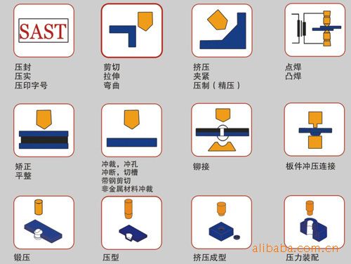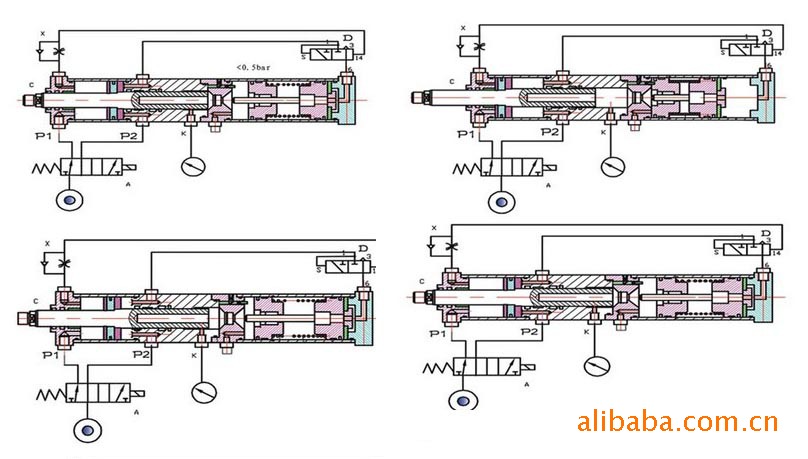 SUNCENTER气液增力缸是一个完整的驱动系统,它所具有的三种不同的结构形式以及适用于不同场合的配件使其可以应用于很广的领域。SUNCENTER气液增力缸先由大面积活塞端的低气压产生小面积的高液压,高液压直接作用在双支承工作缸活塞杆的大面积柱塞端,然后将力直接传递给与工作缸活塞杆别一端通过螺纹相连的施力部分。●大6bar压缩空气以驱动,即可达到1吨-240吨冲压力,无需液压系统。三阶段工作过程:a气动的快进行程,工作缸活塞杆驱动施力部分快速小力接触工件。b 气液增力的力行程,在总行程范围内任一位置,施力部分一接触工件,即自动启动力行程,进行全力冲压。c气动的返回行程●三阶段工作行程的速度及增力的大小与行程在规定范围内均可无级调节并可PLC控制。● 控制简单、可靠,如同控制一个普通气缸一样,由一个二位五通阀即可实现全部控制,如用行程开关控制力行程及快进行程或以不同的压力控制力行程等均可实现。●工作过程中自动启动力行程极大的保证了工作过程无冲击振动、噪音极低,有效的提高了工件加工质量及施力部分整体寿命。●与同吨气缸或液压系统或其他机构相比,能耗极低,动作频次高。●全部进口的密封圈允许使用无润滑压缩空气,巧妙的设计结构完全阻止了压缩空气进入油腔内。● 每只增力缸均设有一个高压测量接口以便于如下操作:接压力表a接压力继电器以设置不受压缩空气影响的增压力,达到预设压力后自动返程b实现用户需要的其他功能。●通过施力部分与工件接触后才启动的力行程可以进行精压,冲裁,拉伸成型,压装等多种冲压加工。●维修与保养时气液增力缸极容易更换,进口密封件磨损极低,如密封件损坏可依据装配图在一小时内更换完毕。