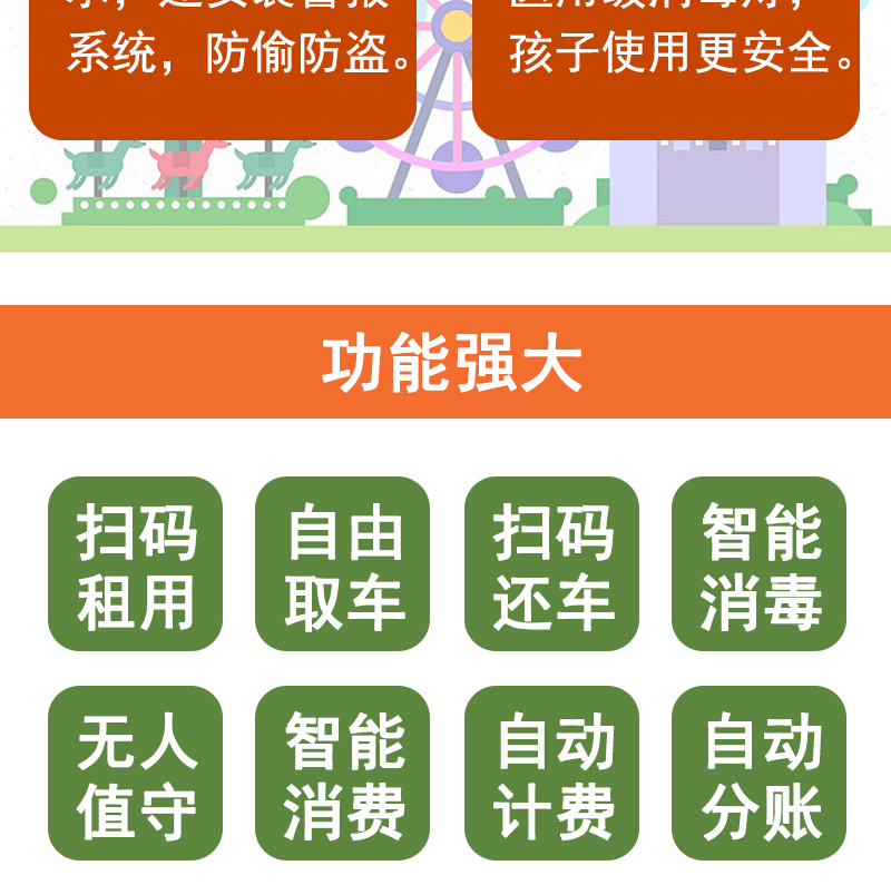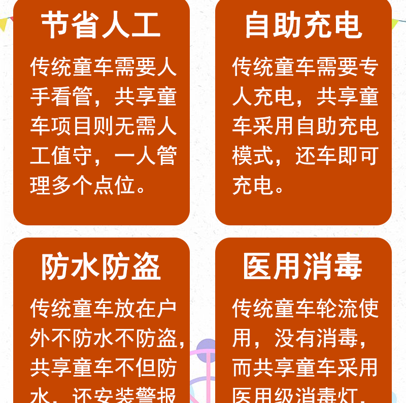 共享童车是设立在动物园、景区、儿童游乐园、大型超市、商场等场所,为解决家长带孩子出行,受重托抱、携带童车带来的诸多不便,适用于以上场所使用的共享童车。