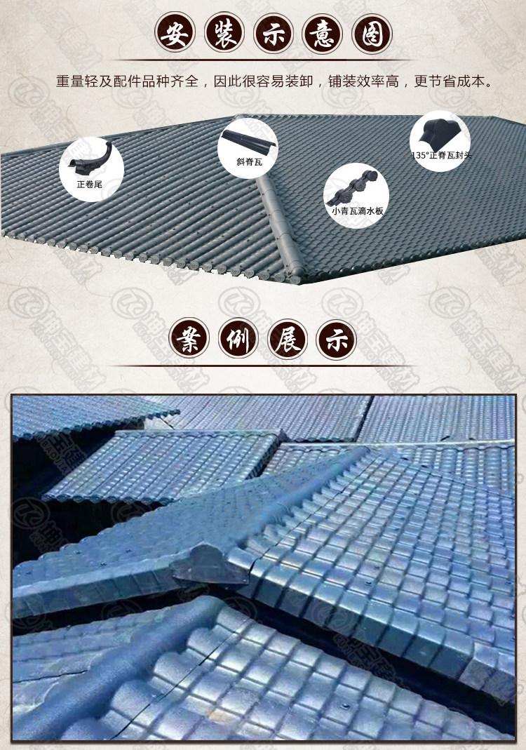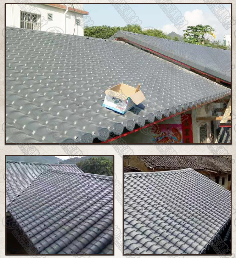 树脂瓦是采用美国GE公司GELOY聚乐ASA高耐候工程塑料研制而成的新型屋面瓦产品。坤宝合成树脂瓦采用先进的两层共挤技术一次加工而成,其中表层为ASA树脂层,底层选用的PVC树脂,通过改性作为主体材料,提高结构的稳定性和耐磨性。该产品的研发成功为高档屋面材料又提供了一种更方便快捷且超耐候的新型环保屋面瓦,古色古香的立体结构,为现代的仿古、西式、欧式建筑又增加了新的创新元素。