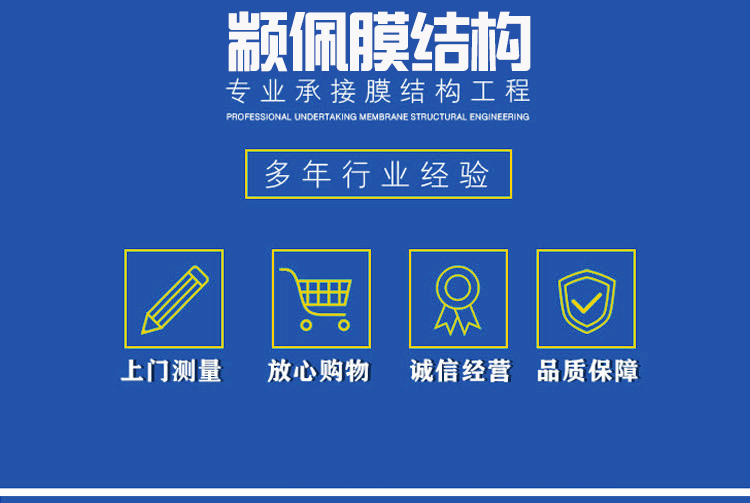 本公司位于上海奉贤区,交通便利,产业配套完善,是一家新型环保建材产品研发,生产,销售,服务于一体的创新型企业,我们多年来一直潜心专注户外遮阳领域,是膜结构产品的生产商及供应商,拥有的生产能力及多年的行业经验,致力于生产并提供给客户的户外遮阳产品,立志成为行业内的品牌。 主导产品有:建筑膜结构,膜结构车蓬,膜结构景观蓬,户外停车篷,自行车棚,体育看台等。 秉承“诚实做人,踏实做事”的企业精神,力求发展创新,我们深信品质是企业的生命,我们将始终奉行“诚信经营,品质为先”的宗旨,共同发展,共创双赢。