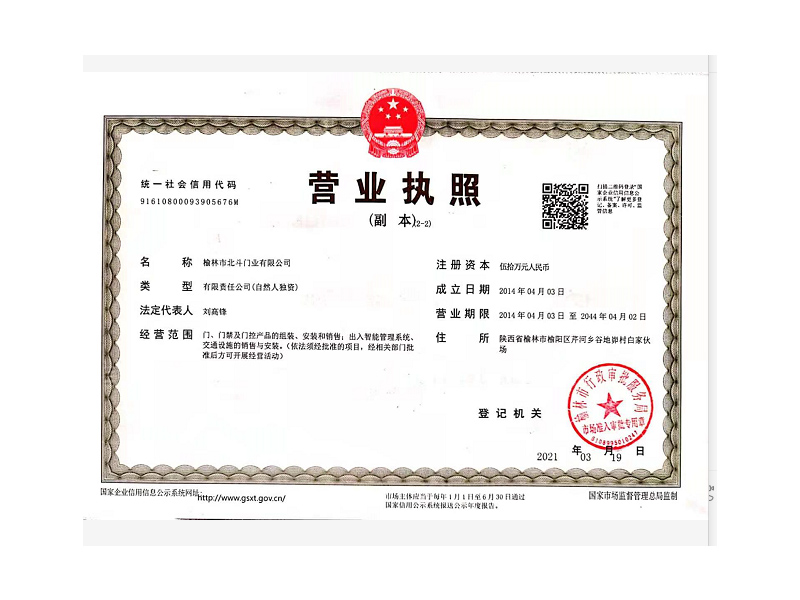 6U9e4GV门、门禁及门控产品的组装、安装和销售;出入智能管理系统;交通设施的销售与安装。