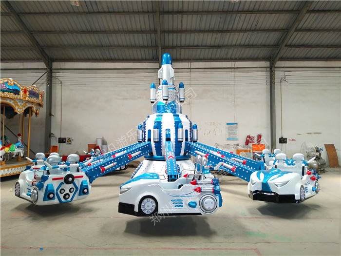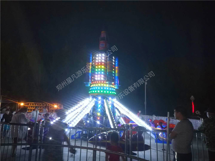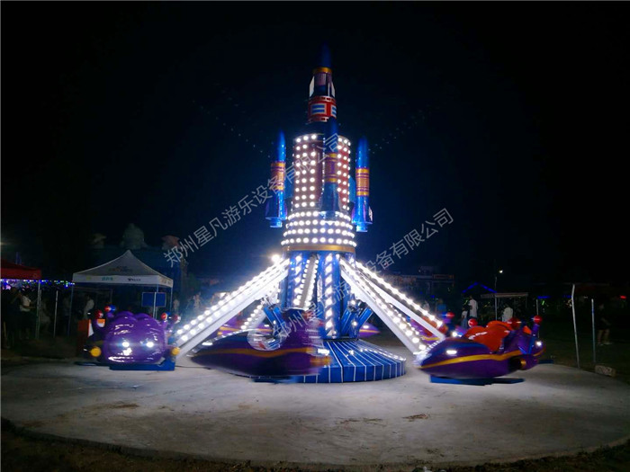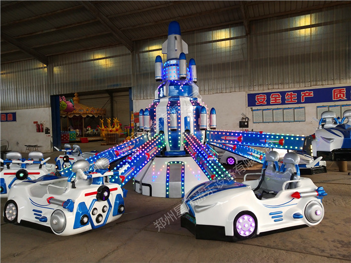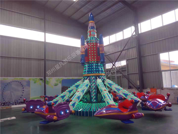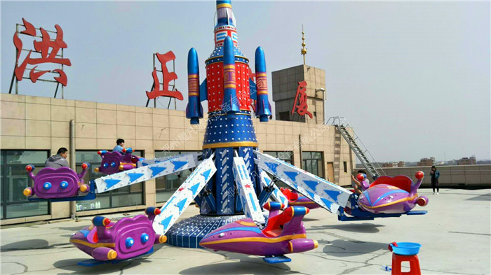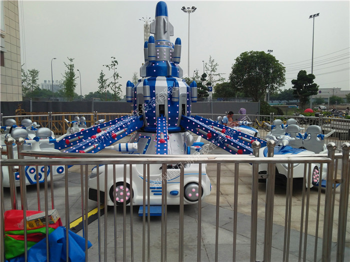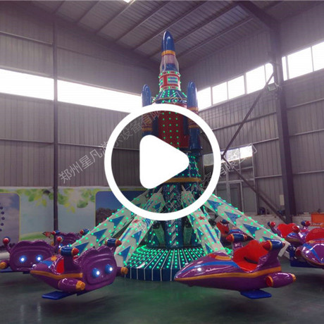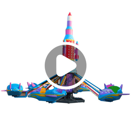 飞机围绕中心火箭或其他造型的装饰旋转,并自由控制上升,游客在飞行中紧握操纵杆随意升降,互相追逐、射击,形象逼真的空战声光效果,令人乐而忘返。