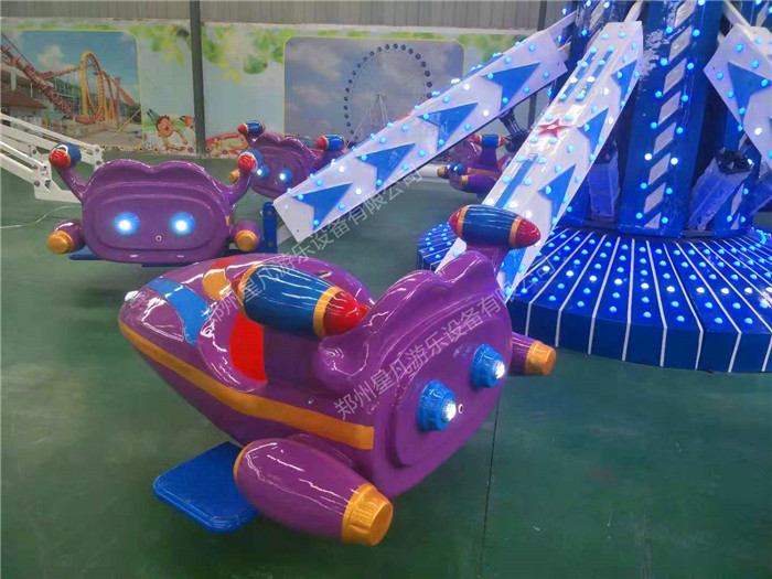 自控飞机是由机械、气动与油压和电气系统组成,是一种绕垂直轴中心旋转、升降自由的升降飞机类游乐设备。郑州星凡游乐设备供应的自控飞机性能优越,操作简单。飞机围绕中心火箭或其他造型的装饰旋转,并自由控制上升,游客在飞行中紧握操纵杆随意升降,互相追逐、射击,令人乐而忘返,新颖的造型、华丽迷人的彩灯装饰,逼真刺激的空战音响效果,它具有高空云驾之惊险,自由之悠闲,是一种游客可以自己控制升降的游乐设施。自控飞机有6臂、8臂、10臂等型号,中央火箭和大臂配有彩灯,现在的自控飞机有自控气压飞机和自控液压飞机两种。