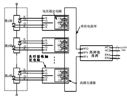 光纤仅能进行高低压信号隔离,无法传递可控硅触发功率,还有一个关键问题未解决,即:在光纤的接收端需要一个+5V的直流电源,这个电源的0端与晶闸管的阴极等电位,而阴极电位可能是几千伏。虽然主电路的电压可以很高,但要得到一个稳定的5V直流电源并不容易,对此耦合取能是一个不错的方法。