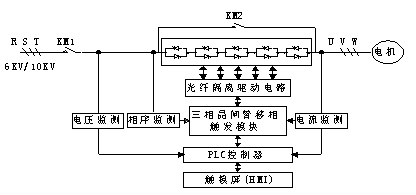 高压固态软起动主要由进线接触器、高压可控硅串联阀组和旁路接触器组成,如图2-1所示。其中高压可控硅串联阀组是功率变换执行部件,由多只可控硅串并联组成,并辅以吸收、均压箝位电路,保证其在高压环境中的可靠性。当进线端得电后,通过控制可控硅的导通角以实现对交流三相电源进行斩波,控制输出电压的幅值。并在起动过程完成后将旁路接触器闭合,软起动器切换到旁路状态,同时关闭可控硅。