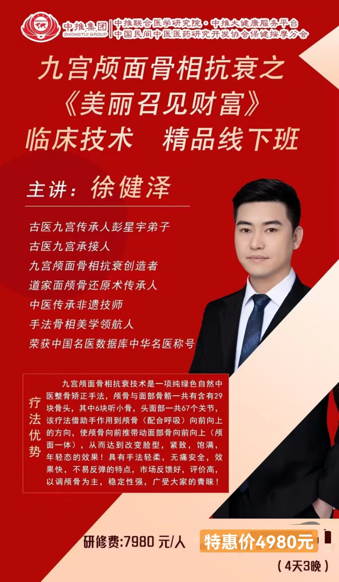 专家介绍:徐健泽 :中推专题授课专家,中推中医专家委员会委员;古医九宫传承人彭星宇弟子,古医九宫承接人,九宫颅面骨相抗衰创造者,道家面颅骨还原术传承人,中医传承非遗,手法骨相美学人,荣获中国名医数据库中华名医称号;从事美业20余年,积累了大量的临床经验及有效案例,确保做到的分析,的判断,评估,带领数千名学员从零基础走向,广受学员的喜爱,好评不断!