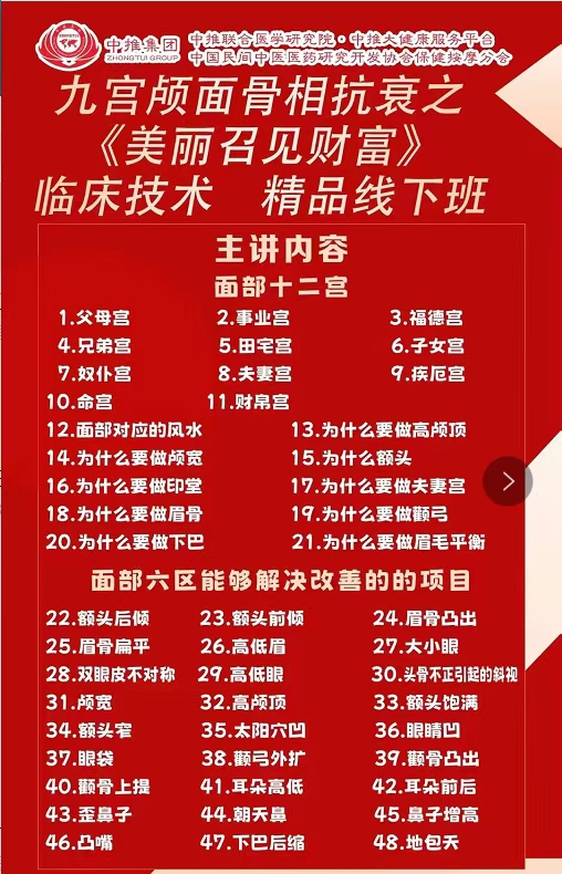 关于举办“九宫颅面骨相抗衰之《美丽召见财富》临床技术精品推广班”的通知一、疗法介绍:九宫颅面骨相抗衰技术是一项纯绿色自然中医整骨矫正手法,颅骨与面部骨骼一共有含有29块骨头,其中6块听小骨,头面部一共67个关节,该疗法借助手作用到颅骨(配合呼吸)向前向上的方向,使颅骨向前推带动面部骨向前向上(颅面一体),从而达到改变脸型,紧致,饱满,年轻态的效果!具有手法轻柔,无痛安全,效果快,不易反弹的特点,市场反馈好,评价高,以调颅骨为主,稳定性强,广受大家的青睐! 打造女性的自信力量,一人一脸、一相一生,你的脸就是面部!颜值、就是你潜在的财富!别让颜值影响了你的运气,好相、好运、好人生,面由心生,心(运)由相改,打造吉祥富贵面相,重塑吸金体质。面部骨相六区设计调整:1.颅顶区2.额颞区3.眼区4.颞颧区5.鼻中区6.下颌区具体讲解四种面部骨骼歪移所导致的面部问题,分析!