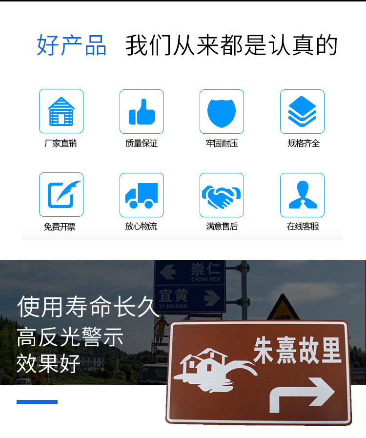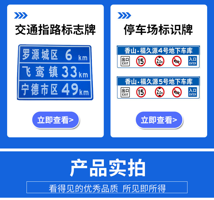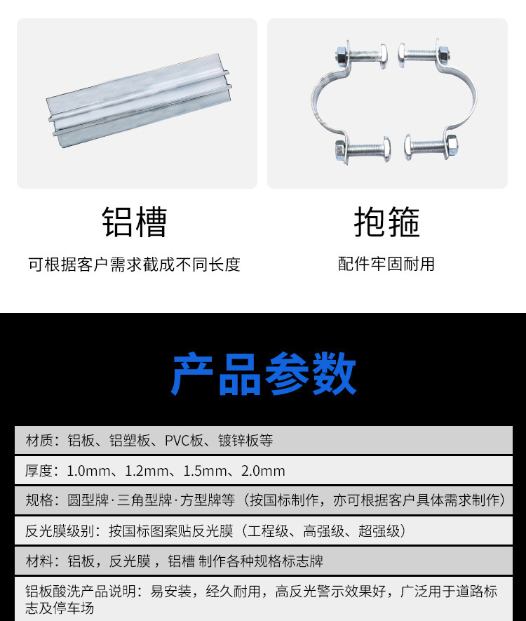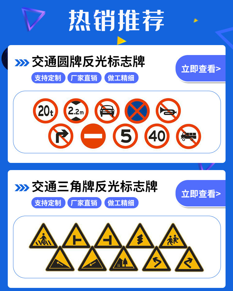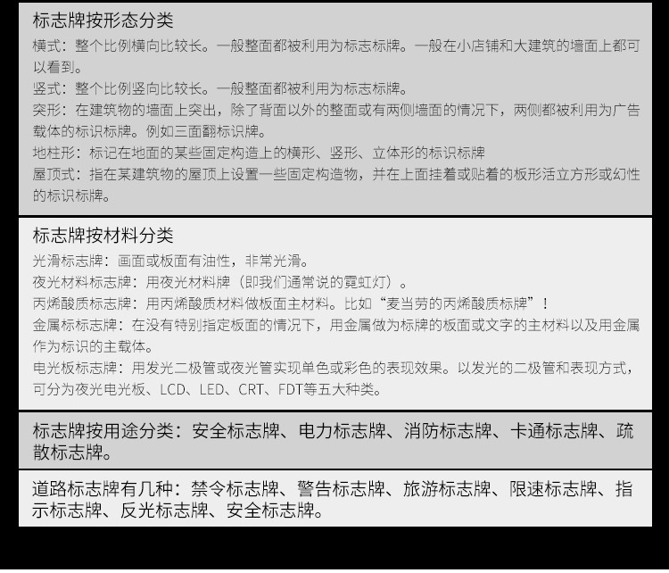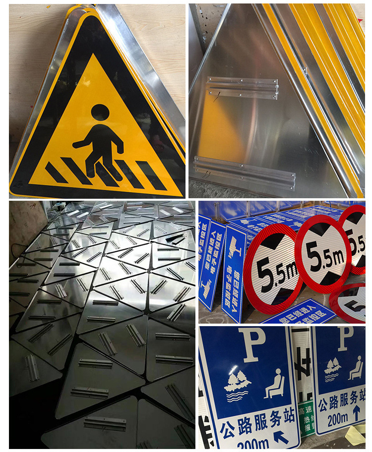 交通道路标志牌是标志板安装在一根立柱上,适用于中、小型尺寸的警告、禁令、指示标志和小型指路标志。用于停车场、小区、交通道路上固定小型交通标志牌、交通广角镜等。美观、耐用、不变形、抗腐蚀、不易生诱,能很好地起到提示作用,安全牢固。指示性标志牌用于引导车辆的行径放假,指引司机的下一步行为,如"提前选择车道"、"公交车道""某某路"等,都是属于指示类交通标志牌的范围。常用蓝底白字、绿底白字、棕底白字的反光膜来展示牌面内容。警告型标志牌常用于交通较为复杂的路口,提醒行人行车应注意的事项,如"减速慢行"、"前方车道变窄"、"急转弯"、"连续急转弯"等,都是属于警告类道路标志牌的范围。常用黄底黑字、并加配黑色边框来展示牌面内容。禁令型标志牌用于提示司机此处路段禁止的动作,如"禁止停车"、"禁止驶入"、"严禁超速"等都是属于禁令型交通标志牌的范畴。
