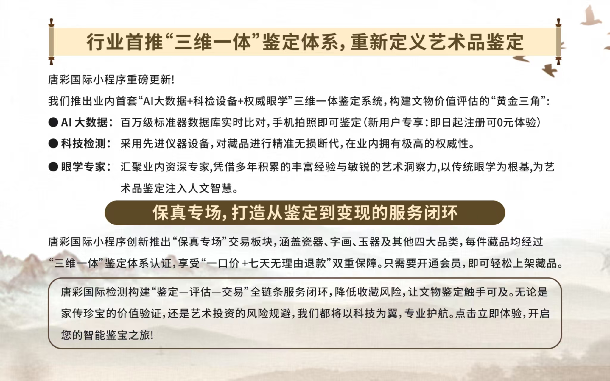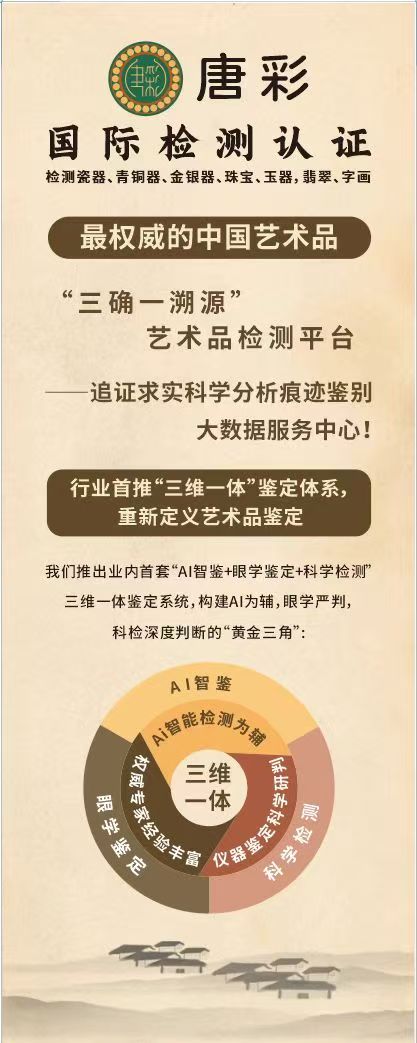唐彩国际在检测领域的性与行业影响力得以充分展现。其「科技 + 人文」的双轮驱动模式,不仅为藏家提供了可靠的鉴定服务,更通过、学术研究与文化传播,推动了中国鉴定行业的国际化与标准化进程。