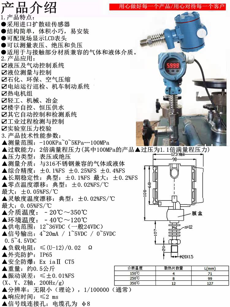 场而设计的一种高性能压力变送器。采用硅压阻传感器, 微型放大器处理电路。具有抗振性和抗冲击性好、精度高、