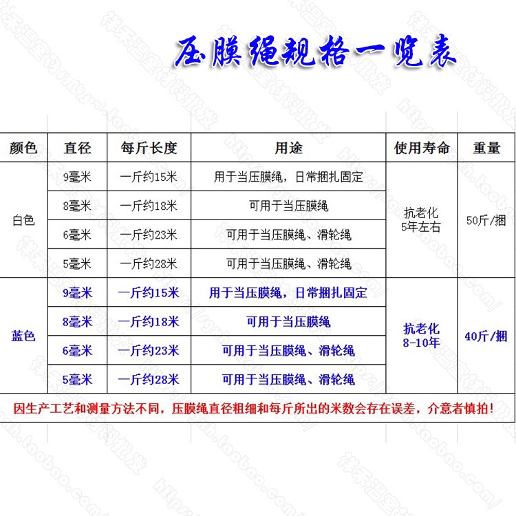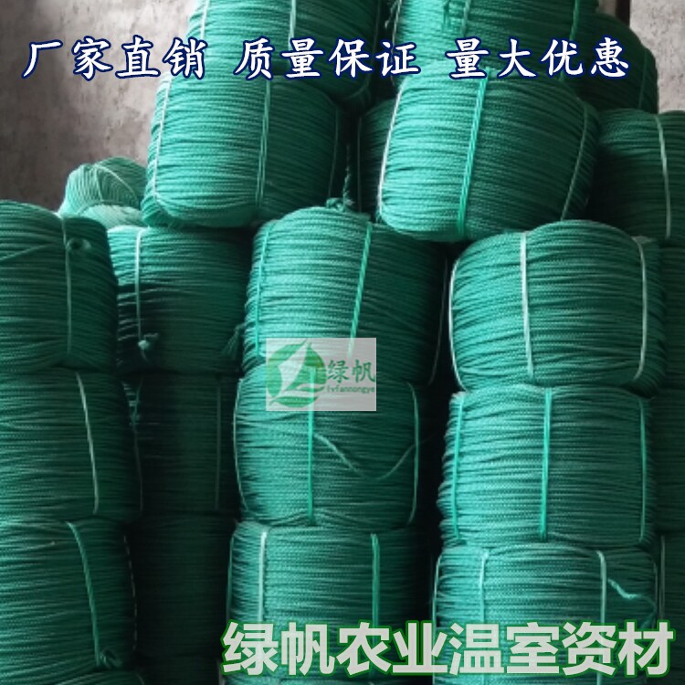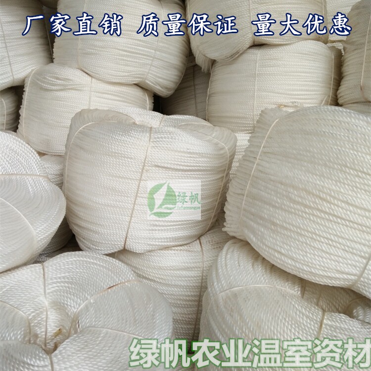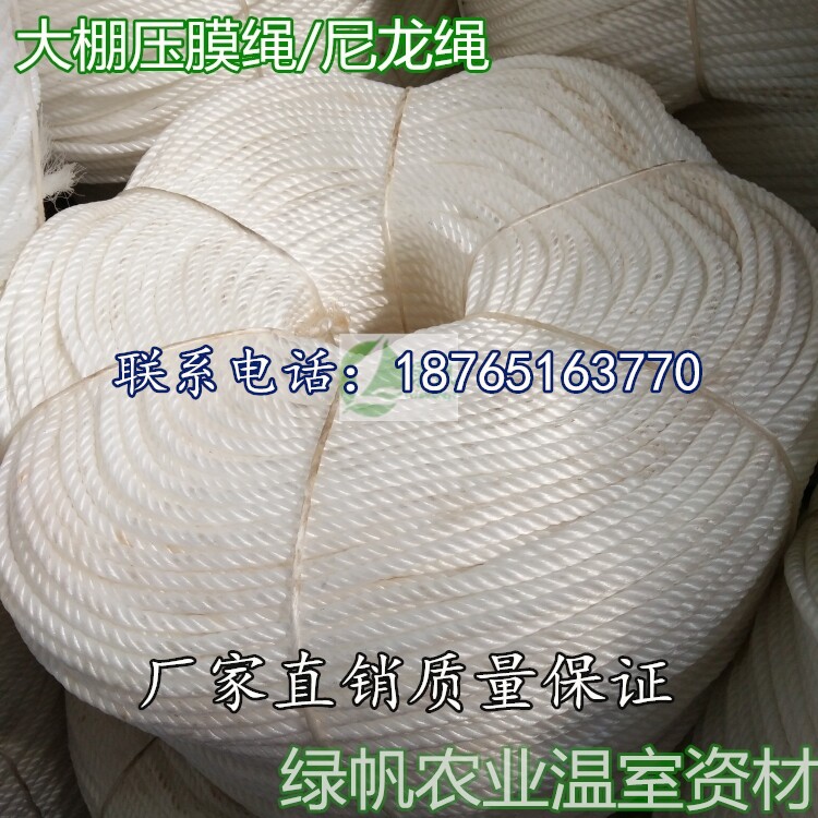 压膜绳均为自产,原料全部为聚乙烯纯原料,不掺加任何增亮剂,保证产品质量,我们生产的压膜绳具有耐老化,拉力大,耐磨,无乱丝、杂丝、生丝,色泽光亮等特点,正常使用寿命可达5-8年,是冬暖温室大棚压膜以及渔业生产等理想的绳索,厂家,2吨以上可以定颜色定规格生产加工。