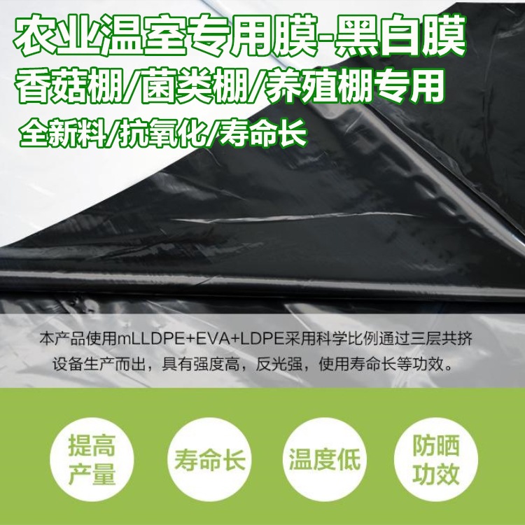 黑白膜是一种新型的菌棚、养殖棚覆盖材料,是我公司推出的,专门为食用菌大棚、养殖大棚等防晒降温的重磅产品!!!产品技术源于美国,核心材料采用美国埃克森美孚原材料,通过在薄膜内添加大量进口抗老化剂,经过先进三层共挤技术吹塑而成。