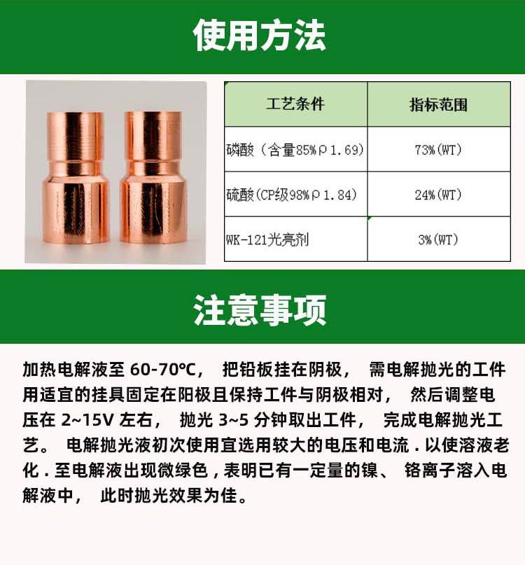 本品能快速有效去除铜表面的氧化物、毛刺、锈迹等,从而能保证抛光表面的均一平滑光泽,处理后不影响导电与焊接性能,能有效地抑制金属表面变色,达到长期保存不变色的目的。本品操作时无烟雾,操作方便,使用成本低。