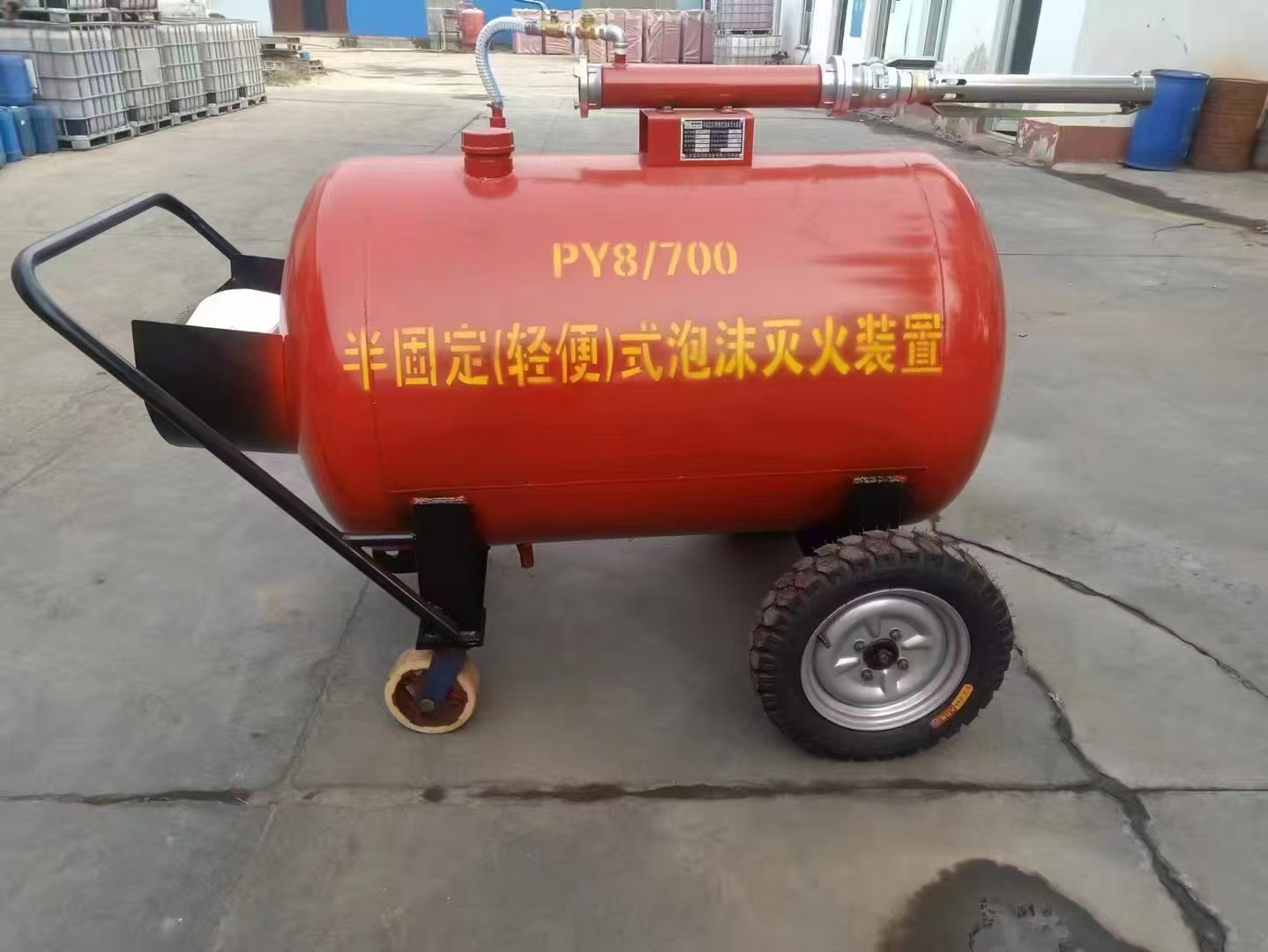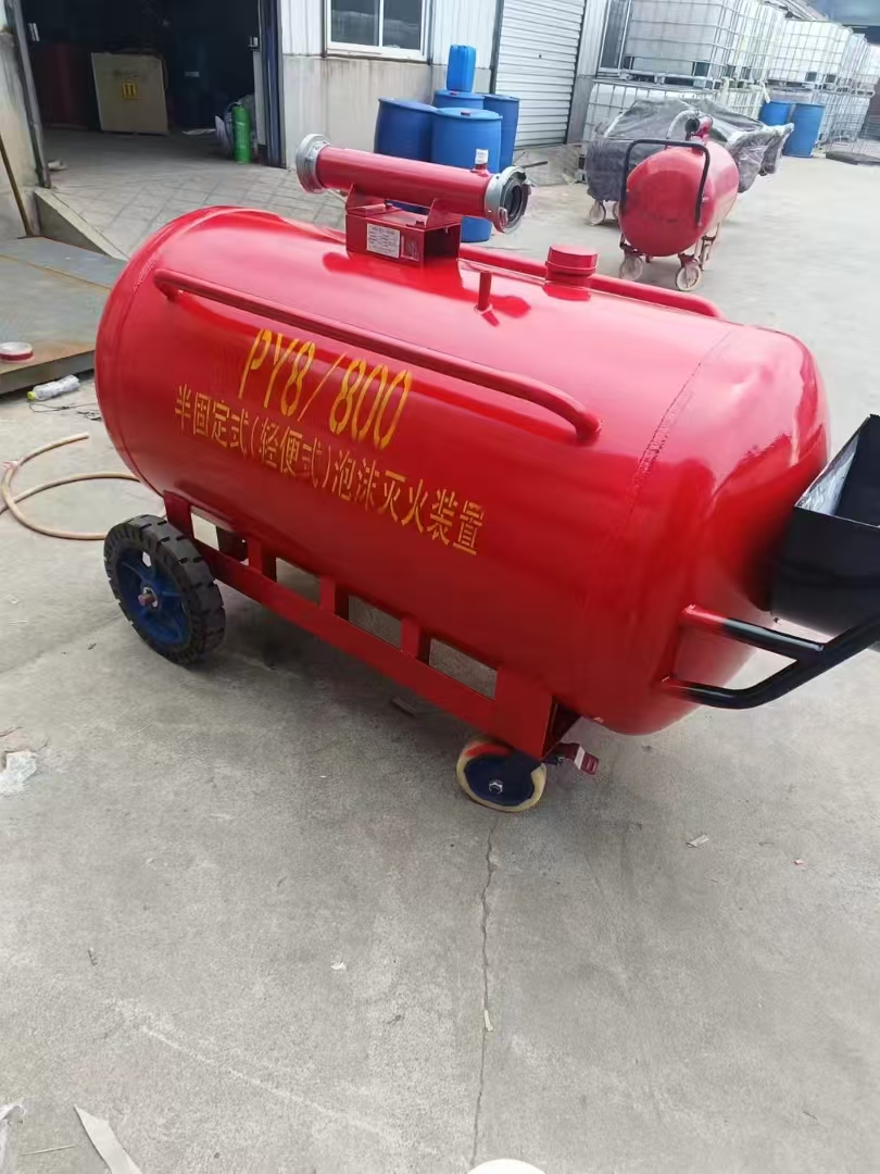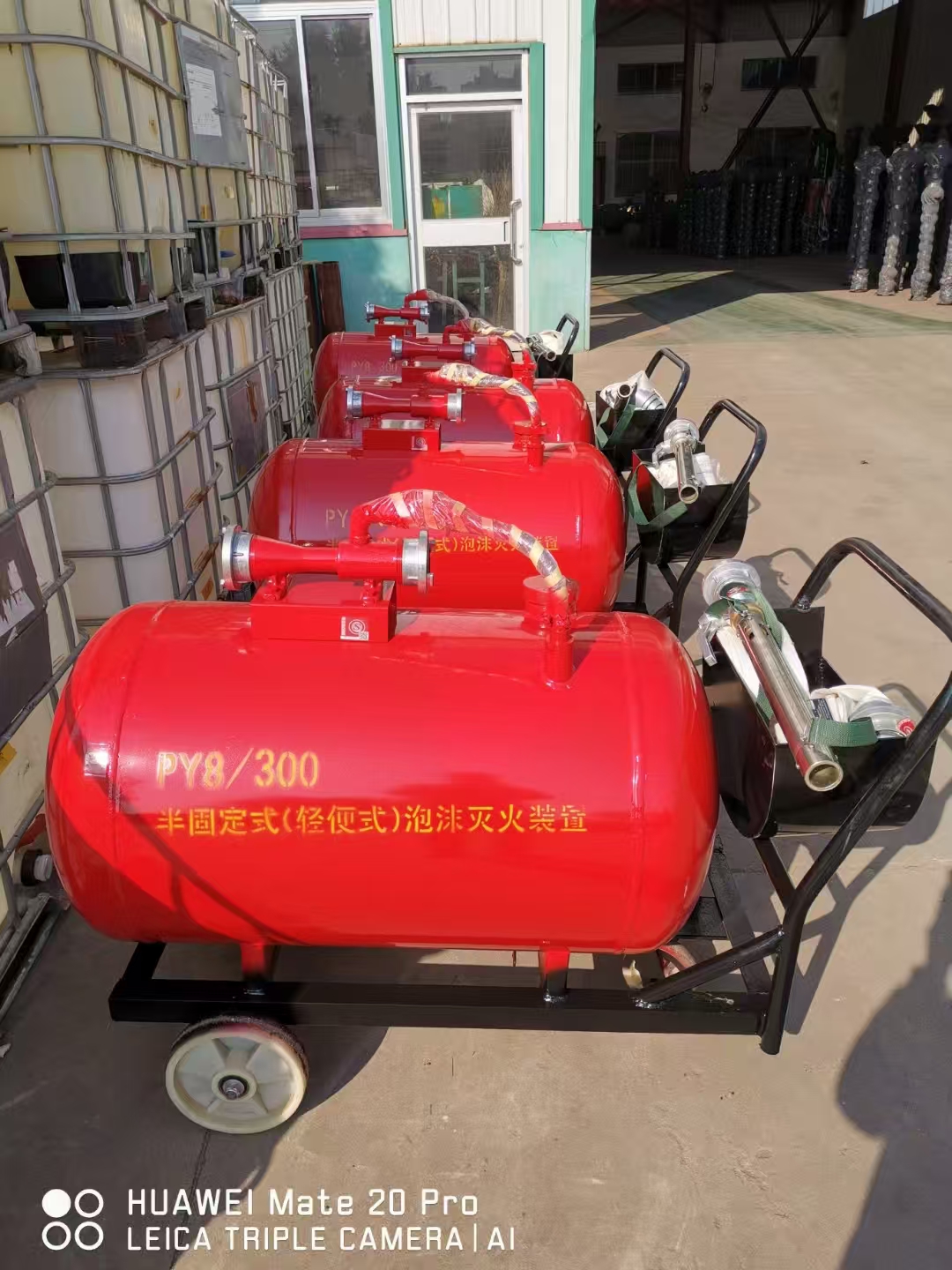 移动式泡沫灭火装置在灭火时其管线式比例混合器的两端的管牙接口与消防水带连接,并连接压力水源,当有不低于0.6MPa压力的水以很高的速度流过比例混合器的喷嘴时,由于射流质点的横向移动的扩散作用,比例混合器的室内形成真空(负压),于是泡沫液储罐内的泡沫液在大气的压力作用下通过吸液管进入混合器,与压力水混合,最终达到一定比例的混合液,经泡沫枪、泡沫产生器喷射泡沫扑灭火灾。 zy16