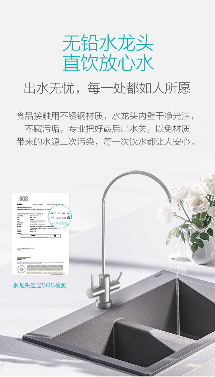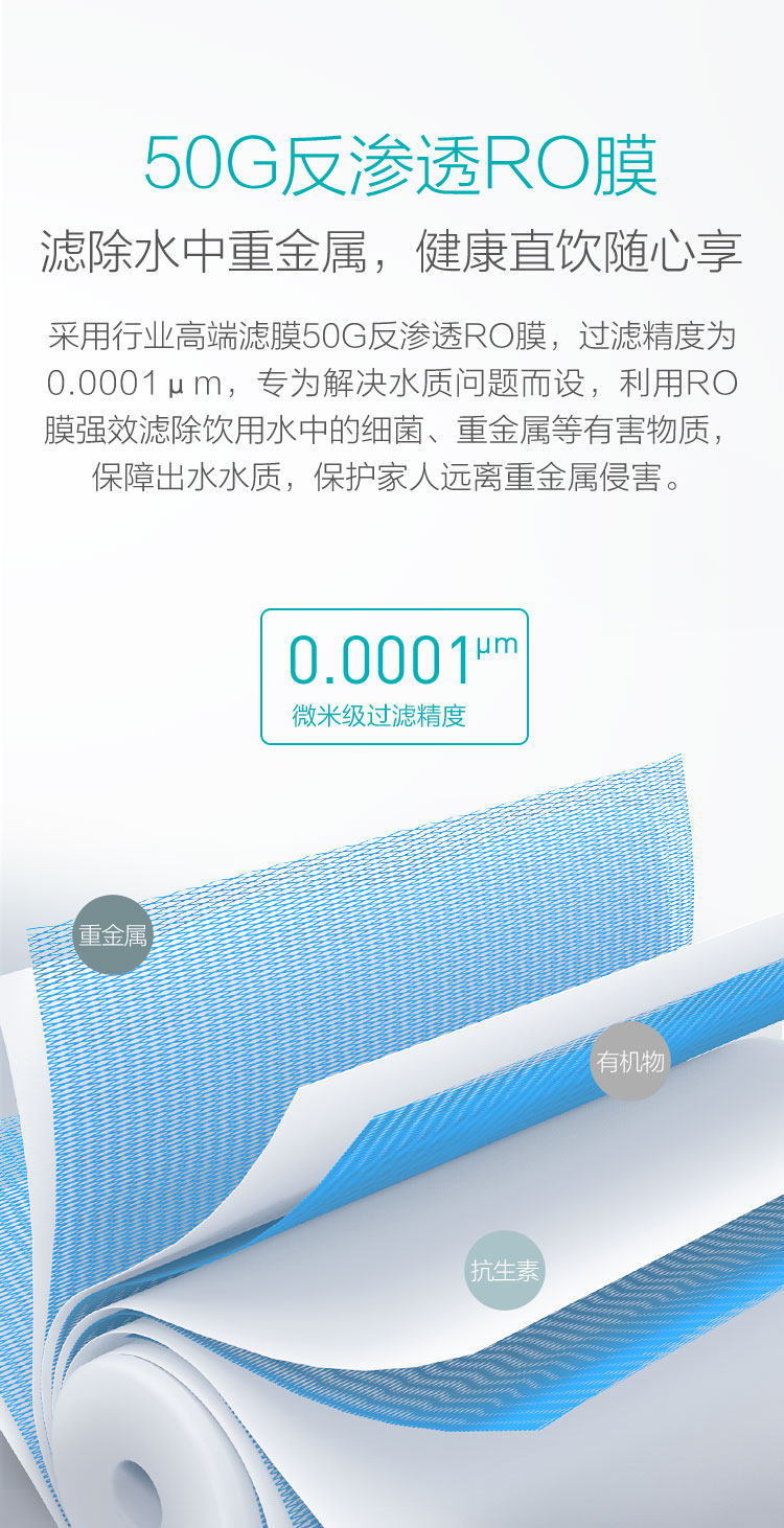 工作原理: 反渗透 柔顺折叠金属膜 超滤 纳米抑菌活性炭 US复合滤芯