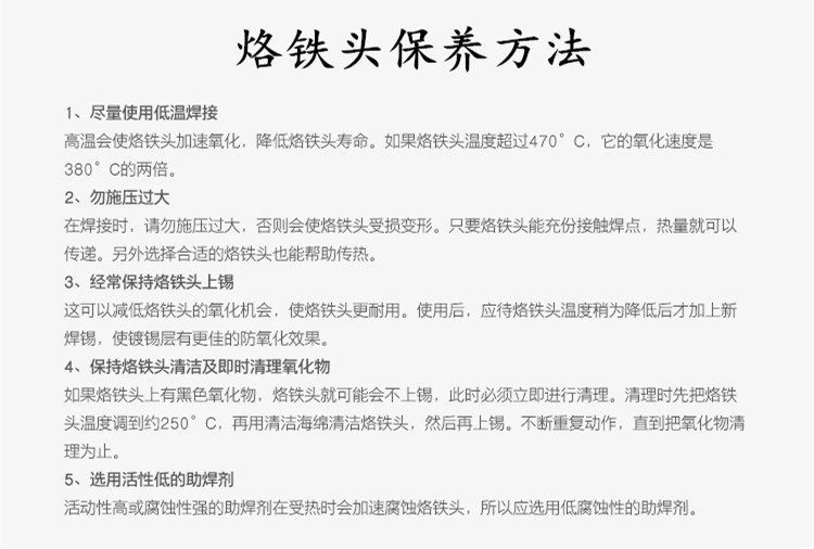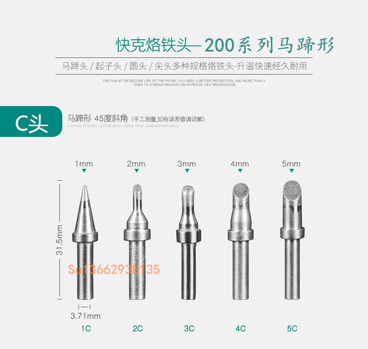 C型(马蹄形)特点:用烙铁头前端斜面部分进行焊接,适合需要多锡量的焊接;应用场合:C型烙铁头应用范围与D型烙铁头相似,例如焊接面积大、粗端子,焊接大的情况适用