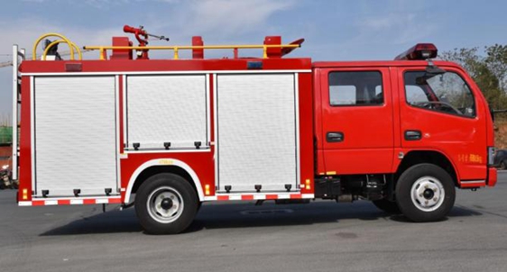 由东风汽车股份有限公司生产的底盘(EQ1070DJ3BDF)改装的2.5吨水罐消防车,整车采用国内的生产工艺与技术。整车结构合理,动力十足,车速高,机动性能好。整车由驾驶室和车身两部分组成,水罐和泡沫容器位于车身中部,器材箱为半包围结构,消防泵安装在车身尾部,便于就行快速救援灭火。驾驶室周围加有红蓝两色爆闪灯,尾部加有35W照明灯一个,消防员史与器材箱.泵房装有照明灯。驾驶室车顶装有长排警灯,控制器和喊话器在驾驶室。车上配置21种消防器材,可用于救援,破拆与灭火。该车的优势是性能强劲,机动灵活,可使灭火人员车辆快速到达现场。