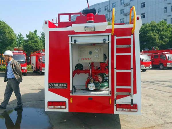 凯普特水罐消防车是由二类汽车底盘、水罐、水泵、管路、仪表电路系统等部件组成,该车装配铝合金后爬梯(可拆卸),泵房在整车尾部,罐体为钢板焊接式,罐体材质为碳钢板,罐体内部做防腐处理,载水 2.5 方。该车装备 CB10/20 消防泵,PS20 消防炮。