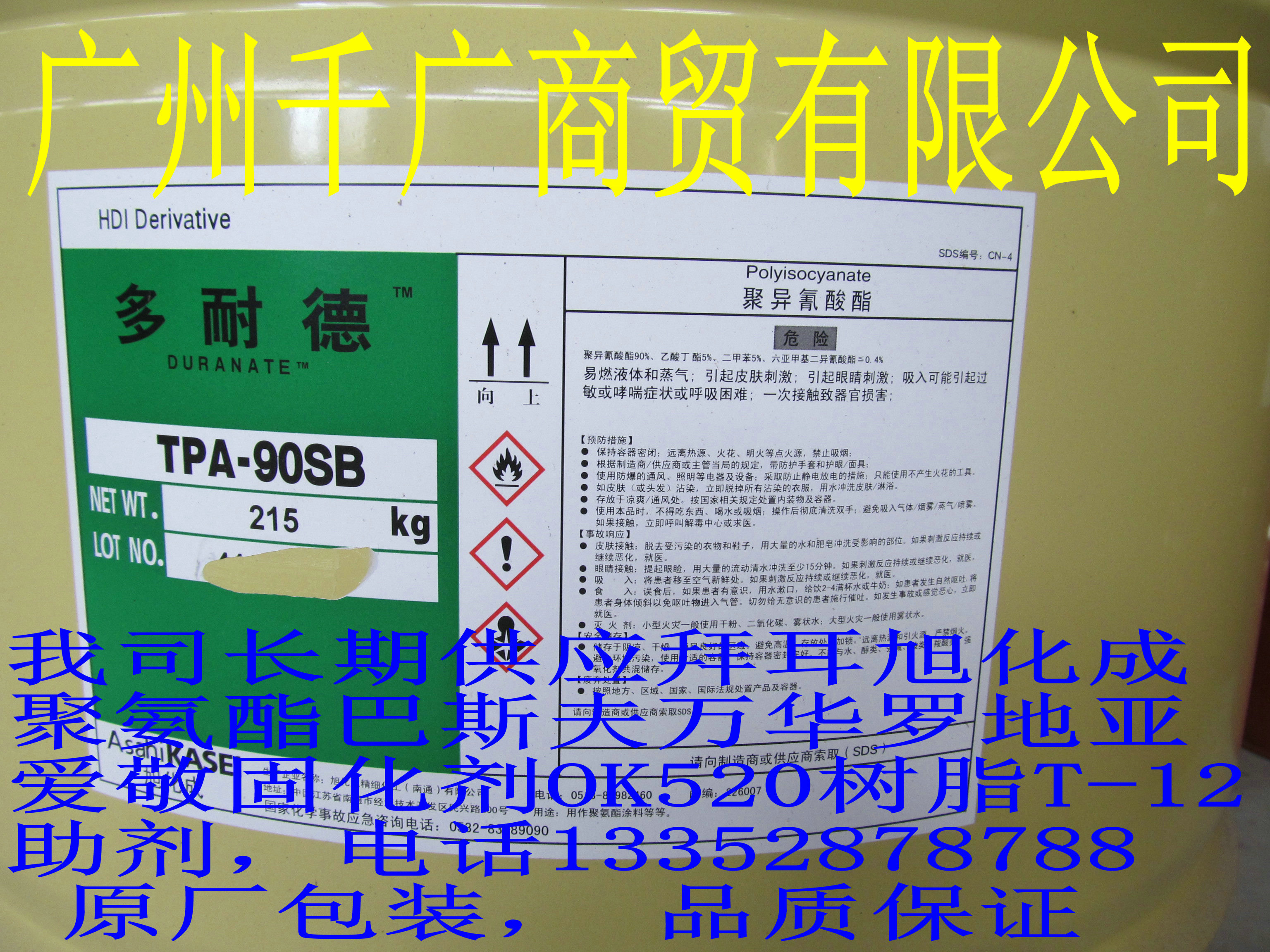 广州千广商贸有限公司成立于2010年,主要代理和经销德国拜耳N3390、N75、L75、N3300、3175,旭化成固化剂TKA-90SB、TPA-90SB、22A-75PX、100,万华HT-100,聚氨酯90B、100,罗地亚HDT,...