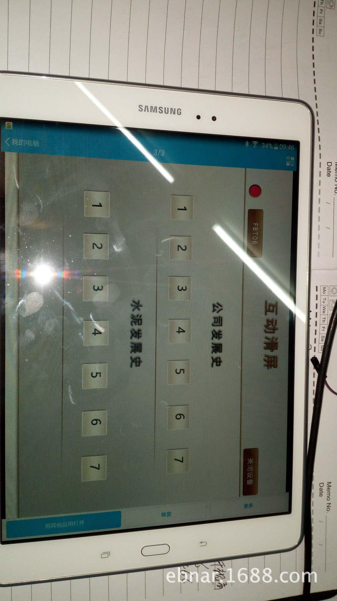 滑轨电视由定制滑行轨道、等离子电视、红外传感器、灯箱、计算机组成。在类似坐标轴的展墙上镶嵌各种案例图片,同时制作一组可滑动的机械结构以悬挂液晶电视。 观众可以上、下、左、右推动液晶电视找寻背景中的感应点。当观众推动等离子电视到不同的点位,使屏幕与点位重合,此时传感信号被触发,屏幕将自动播放该部分的视频内容。