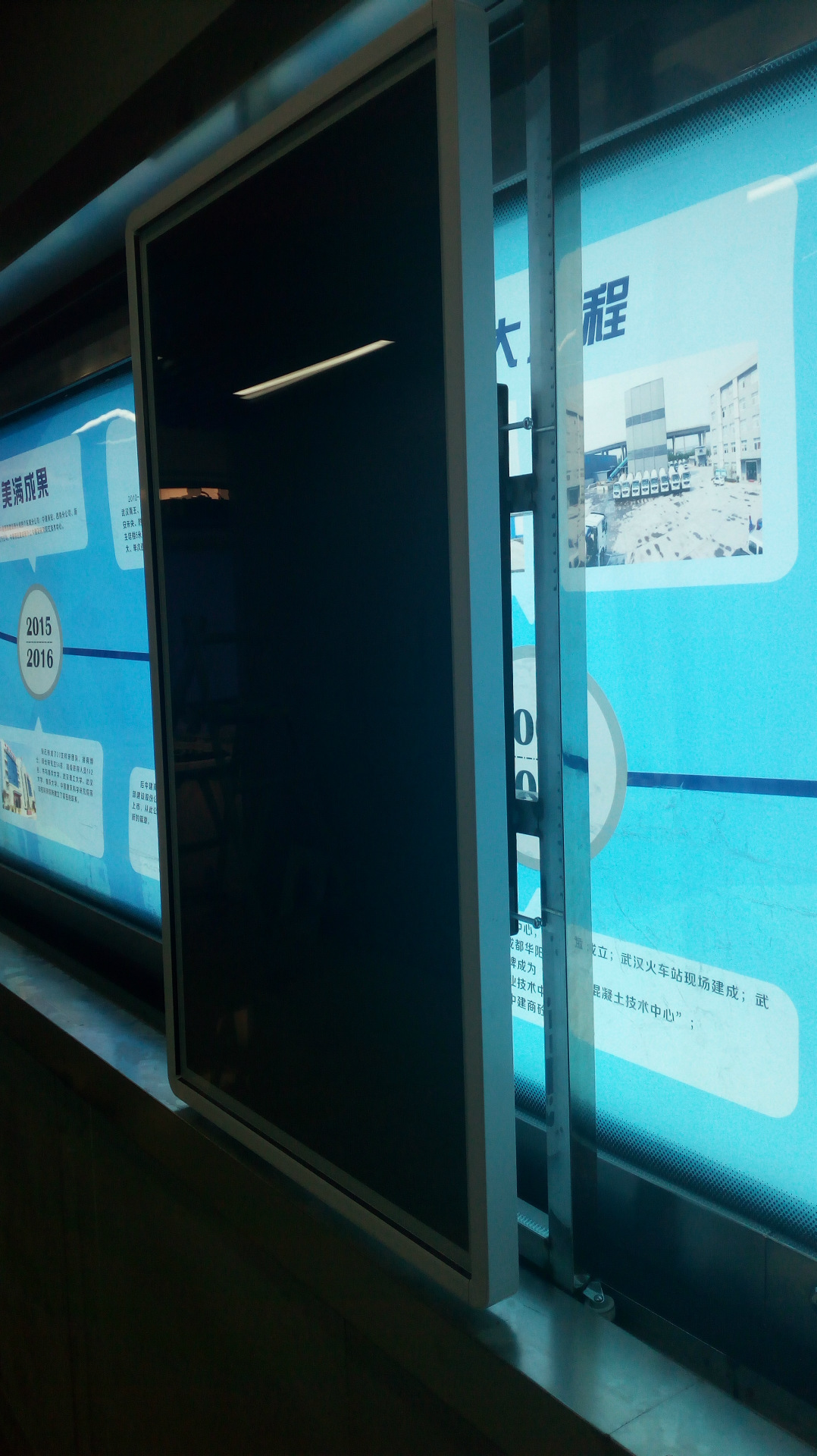滑轨电视由定制滑行轨道、等离子电视、红外传感器、灯箱、计算机组成。在类似坐标轴的展墙上镶嵌各种案例图片,同时制作一组可滑动的机械结构以悬挂液晶电视。